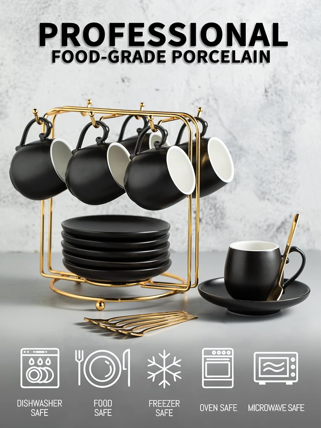 LYEOBOH Espresso Cups and Saucers Set, Ceramic Coffee Cup 3 Ounces Small Demitasse Cups Espresso Mugs with Spoons & Metal Stand for Cappuccino, Latte, Tea, Set of 6, Black
