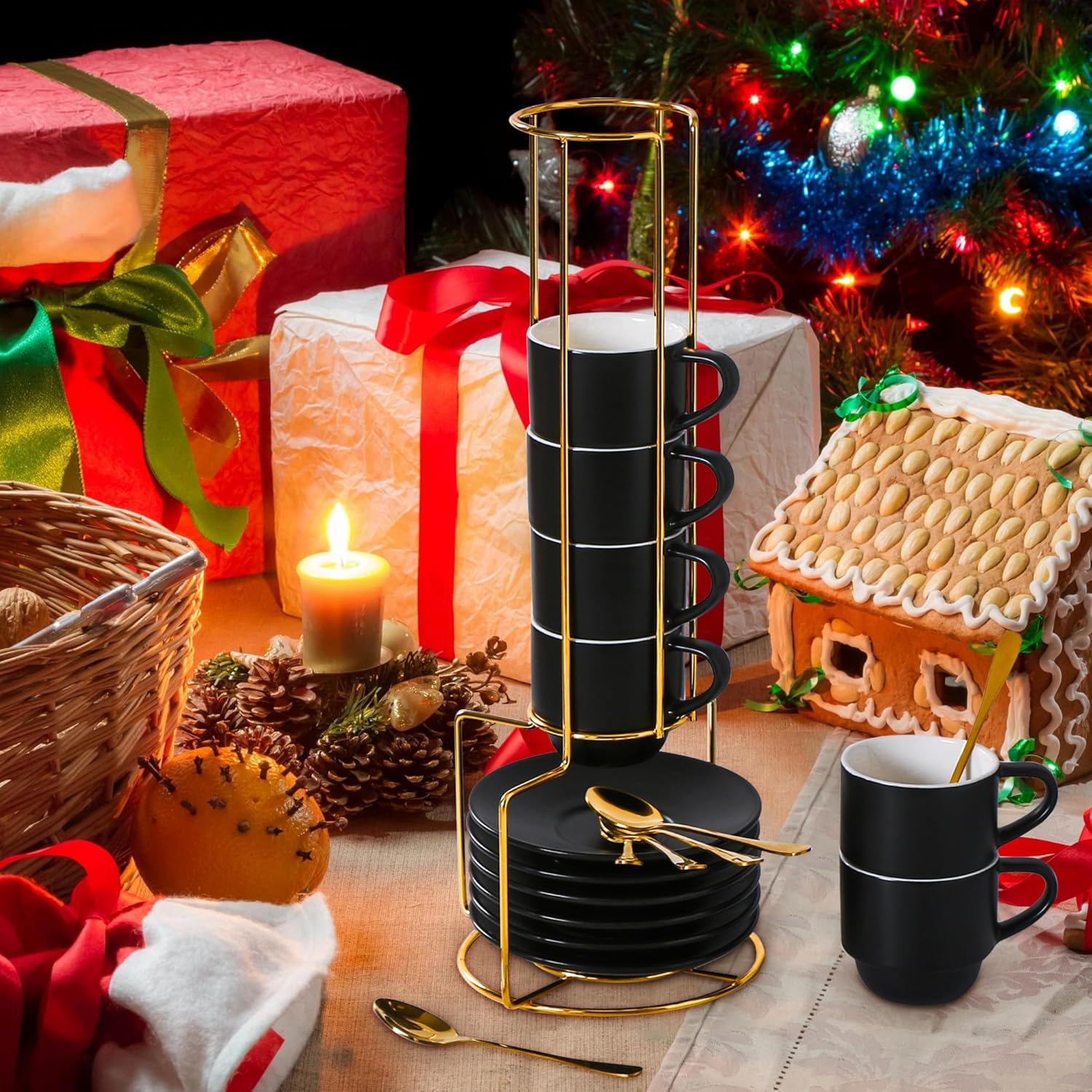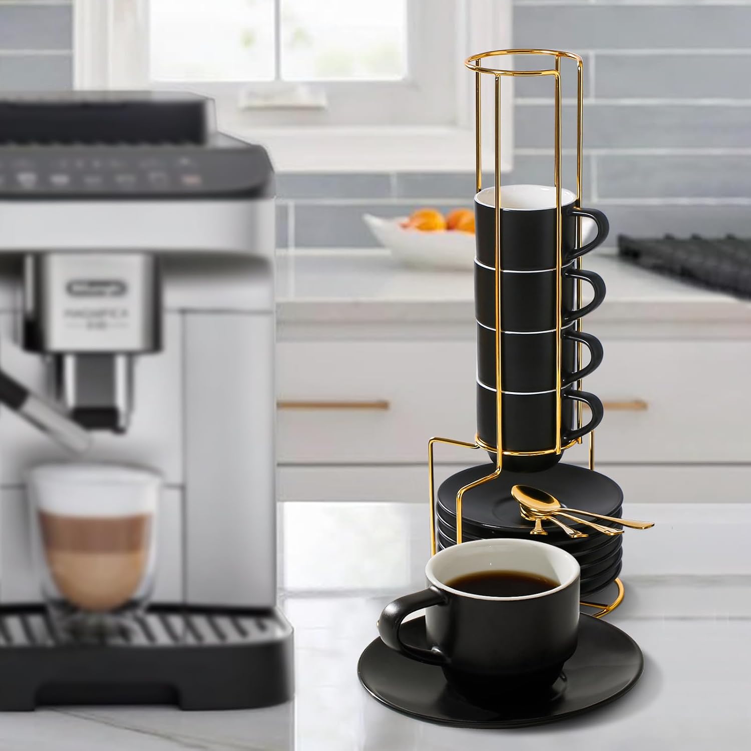 Lareina Porcelain 3-Ounce Espresso Cups Set of 6, Small Stackable Coffee Cups with Saucers, Spoons and Metal Stand - Ceramic Demitasse Mugs, Double Shots Expresso Cup, Matte Black