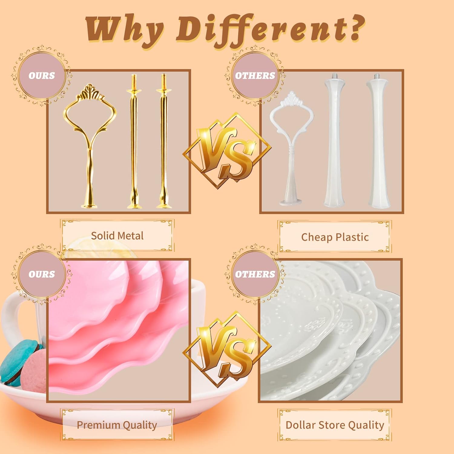 - Why Different: This cupcake stand is made of 4MM extra thick food grade plastic, much more better than 1mm dollar store quality. The bold metal rod also provide excellent texture and stability that can not be given by others