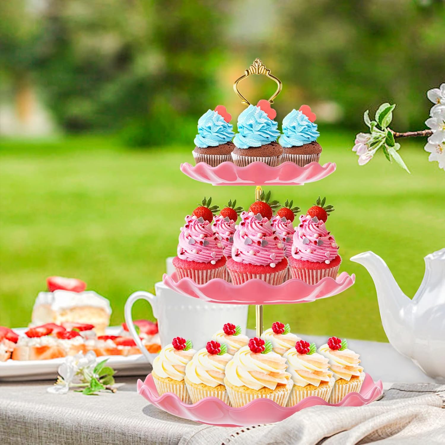 3 Tier Cupcake Stand Holder, BACUTHY Plastic Cup Cake Stand Tower with Tiered Serving Tray for Cupcakes, Donuts, Fruits and More, Pink