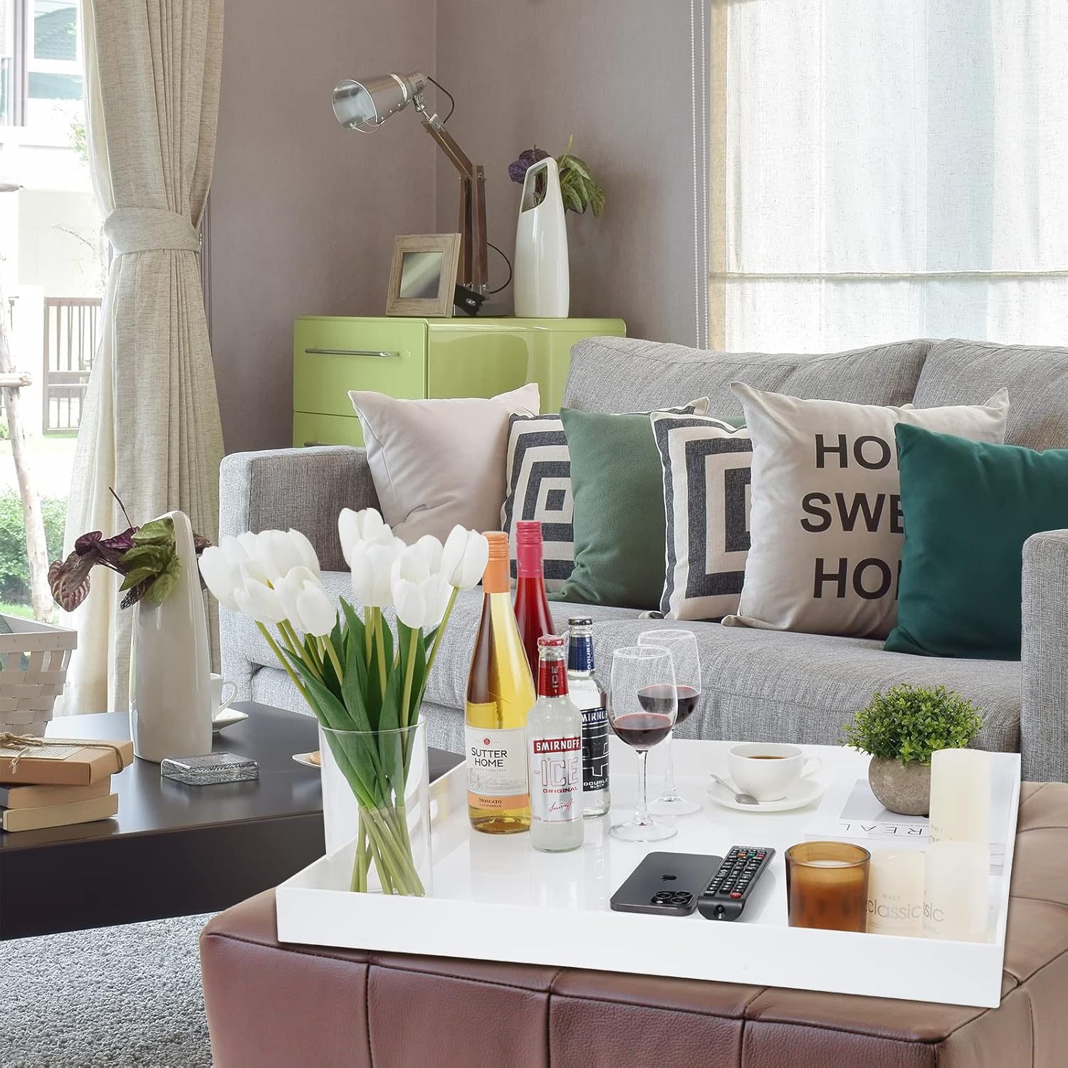 - Material: Our serving trays with handles are made of glossy white acrylic, Which is high quality and sturdy, The acrylic is a environment friendly material, Our square extra large acrylic trays are perfect ottoman trays for living room