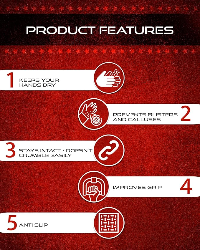 - MAXIMUM MOISTURE ABSORPTION - 100% Magnesium Carbonate lifting chalk powder absorbs moisture from sweaty hands and fingers with ease, and was especially designed and tested to prevent slipping on the barbell or rings.