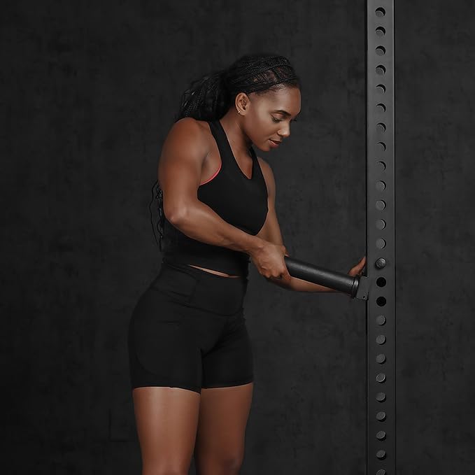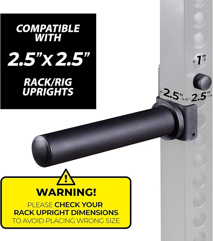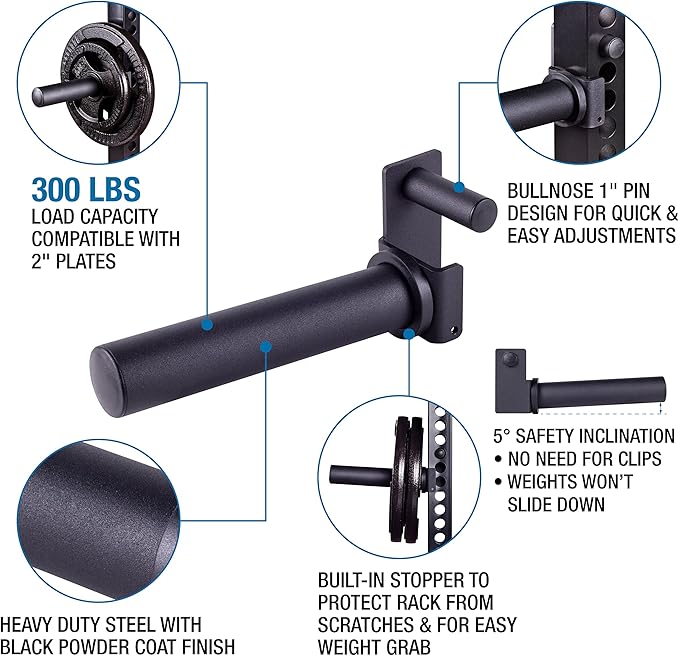 - QUICK & EFFORTLESS ASSEMBLY: Easy to insert and lock-in design, save your energy and time to install more complicated assembly. Insert the bullnose of 1” into the power rack's hole and swing down to lock it in place. This quick and easy adjustment makes our weight horns more convenient for loading and unloading the weight plates.