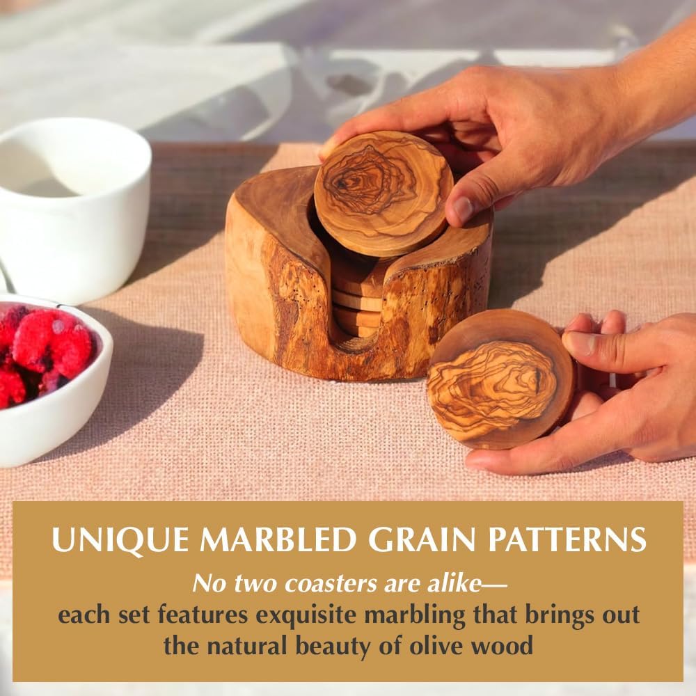 - SUSTAINABLY SOURCED AND NATURALLY MADE — 100% natural and crafted without harmful chemicals, these coffee coasters are both beautiful and Earth friendly. Sourced from olive wood branches at the end of their fruit-bearing life, each unique wood coaster supports sustainable practices while maintaining a stunning appearance.