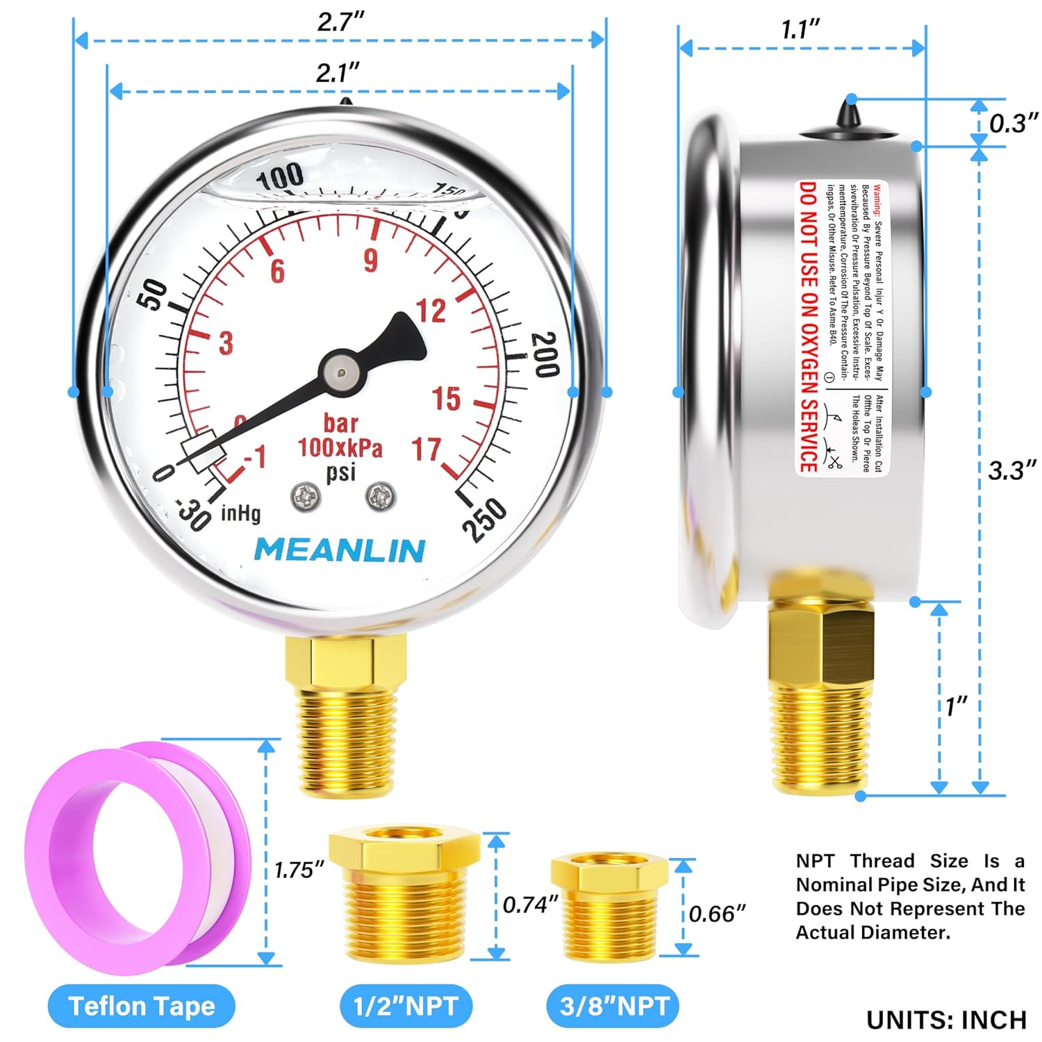 MEANLIN MEASURE -30inHG~250Psi Stainless Steel 1/4" NPT 2.5" FACE DIAL Vacuum Pressure Gauge, Lower Mount, with 1/4" x 1/2" NPT and 1/4" x 3/8" NPT Hex Bushing