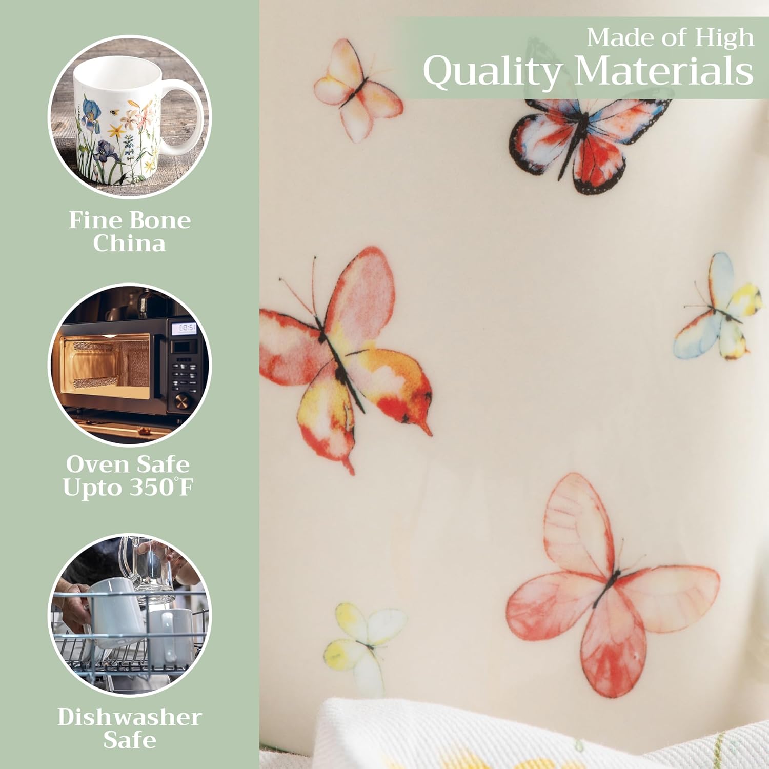 - Easy Care & Maintenance: Microwave, dishwasher, and oven safe up to 350°F. These bone china mugs are built for convenience and durability, making cleanup and reheating simple without compromising on quality