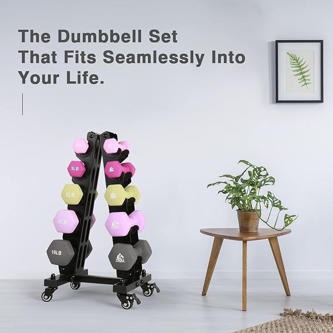 - The Dumbbell Set That Fits Into Your Life: Space saving and versatile, our dumbbell set fits seamlessly into your home, helping to integrate fitness into your everyday lifestyle. This set includes 5 pairs of hand weights(2lb, 3lb, 5lb, 8lb, 10lb) and comes with a solid A-frame dumbbell rack. With dumbbells ranging from 2 to 10LB going up in small increments, you can incorporate them into various workout, such as running, aerobics, physical therapy and even yoga routines.