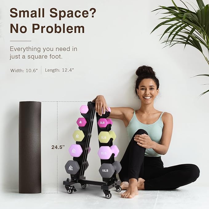 - Space Saving: This Lionscool dumbbell set is designed for even the smallest of spaces. Taking up a smaller footprint than your slim bedside table, the rolling dumbbell rack is ready to hold everything in just a square foot. What about the height? Well, you can simply take out your yoga mat and compare with it. The height of the rack is the same as the height of an average rolled-up yoga mat, which is 24 inches.