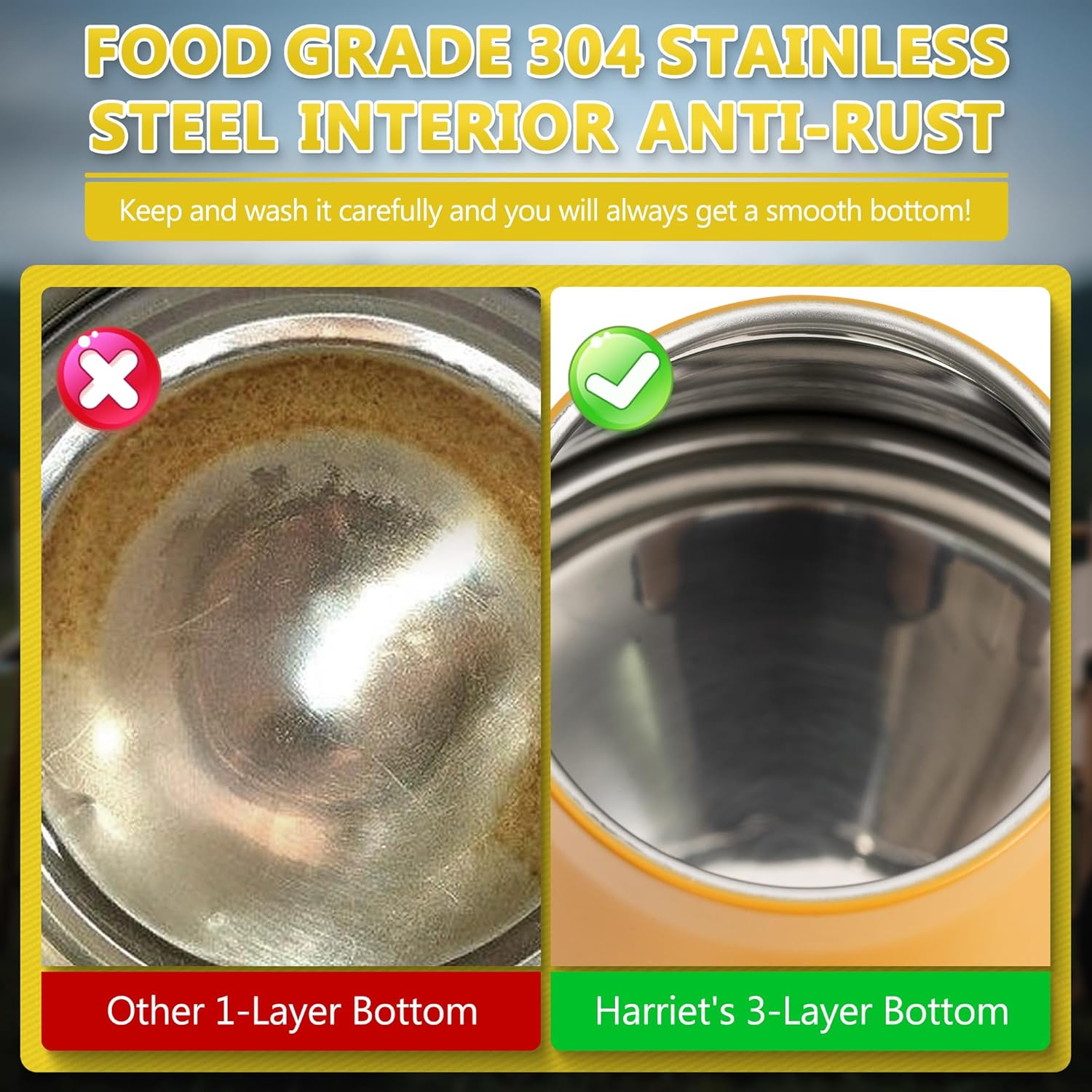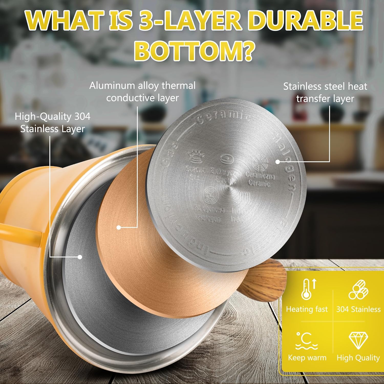 - Three layer base enhances heat retention and durability: Professional grade 18/8 stainless steel construction with triple layer base prevents rust and leaks; Uniform heat circulation ensures rapid boiling on gas, induction or electric stoves; Medium heat setting below 1400W recommended for induction compatibility