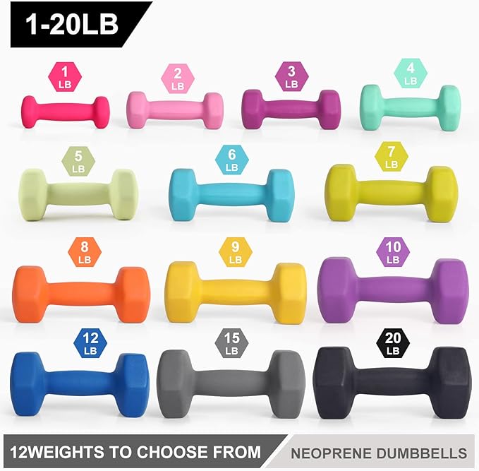 - Choose from 13 Different Sizes:LIONSCOOL neoprene coated dumbbell weights are sold in pairs and available in 1, 2, 3, 4, 5, 6, 7, 8, 9,10,12, 15 and 20 pounds, which allow you vary the intensity of your workouts. Each Dumbbell is color coded with clear printed weight number on the end caps for easy and quick identification.
