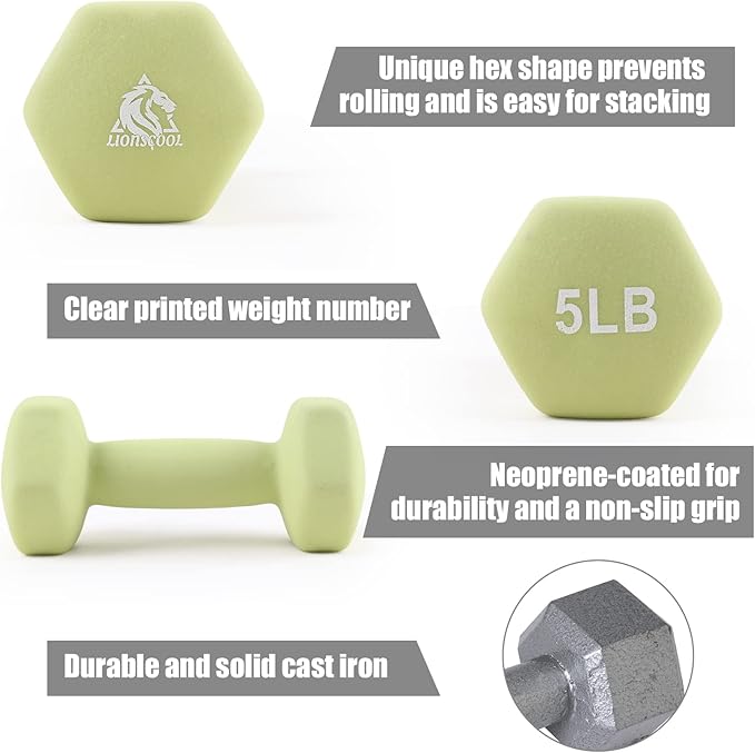 - Comfortable Grip and Anti-Roll Design: The neoprene coating on LIONSCOOL dumbbells offers a comfortable and secure grip and protects fitness equipment from getting damaged. The hexagonal shape of the dumbbell heads prevent the dumbbells from rolling away when setting them down to perform other exercises.