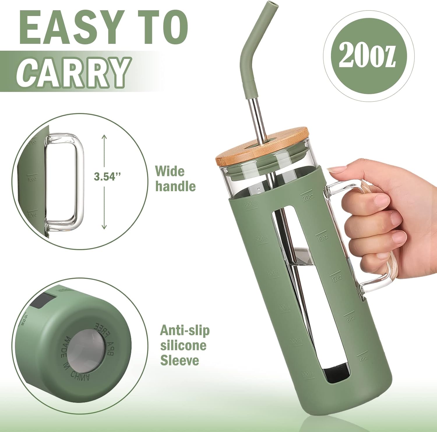 Kodrine Tumbler with Lid and Straw, 20 oz Glass Coffee Tumbler with Handle, Smoothie Cup with Bamboo Lid | Time Marker | Silicone Protective Sleeve, BPA Free - Olive