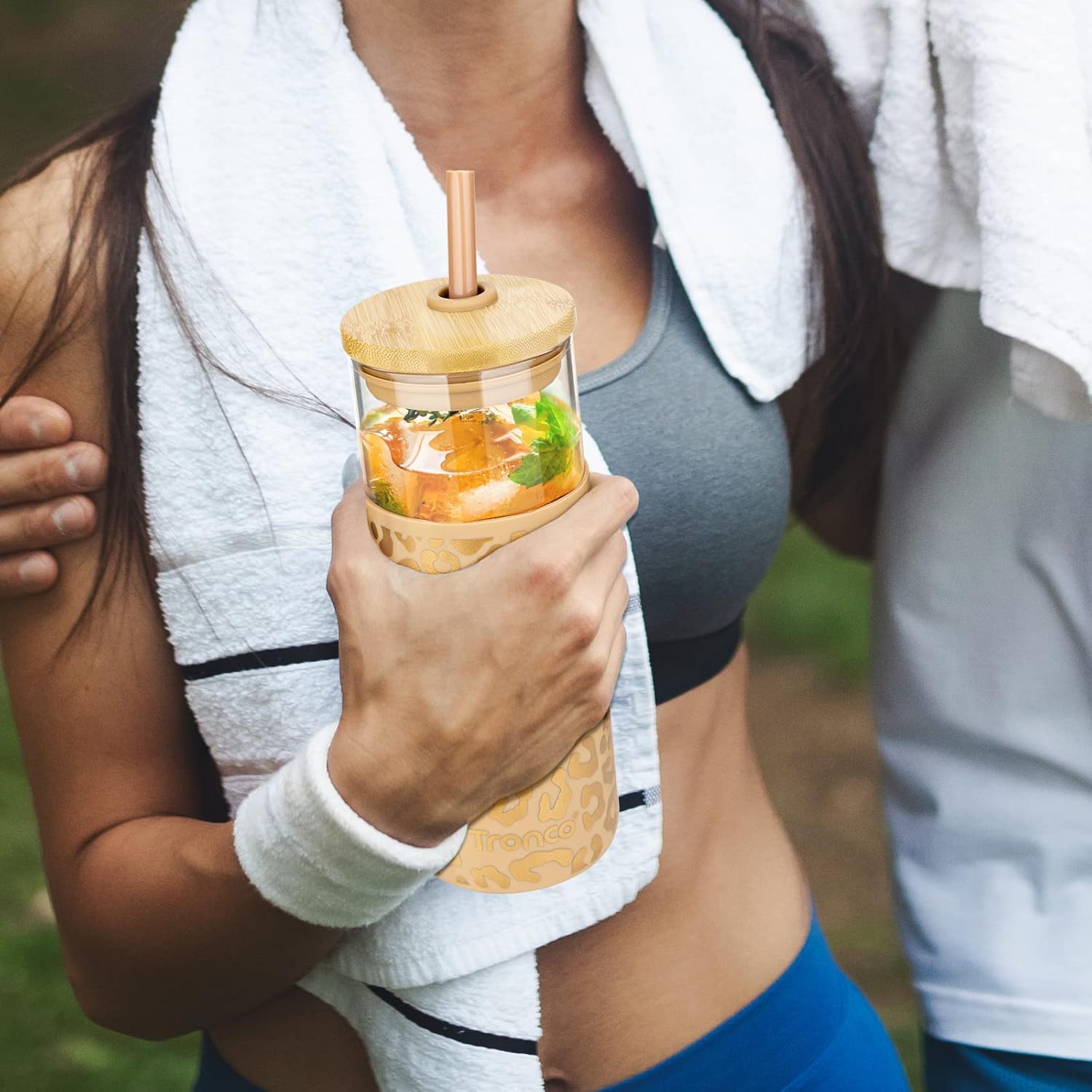 Tronco 20 oz Glass Tumbler with Straw and Lid- Glass Cup with Lid and Straw, Iced Coffee Cup Reusable, Smoothie Cups, Bamboo Lid and Protective Silicone Sleeve - BPA-Free