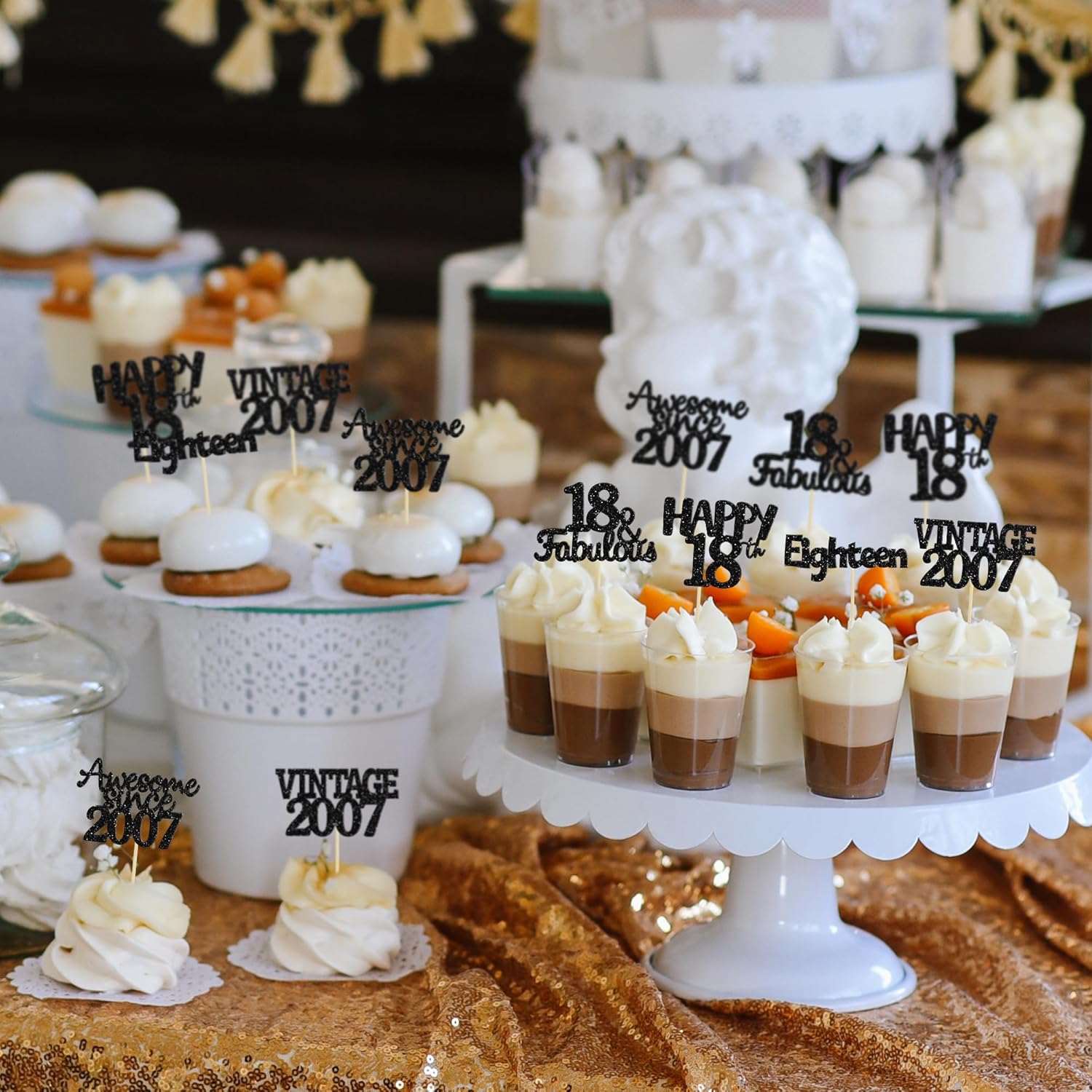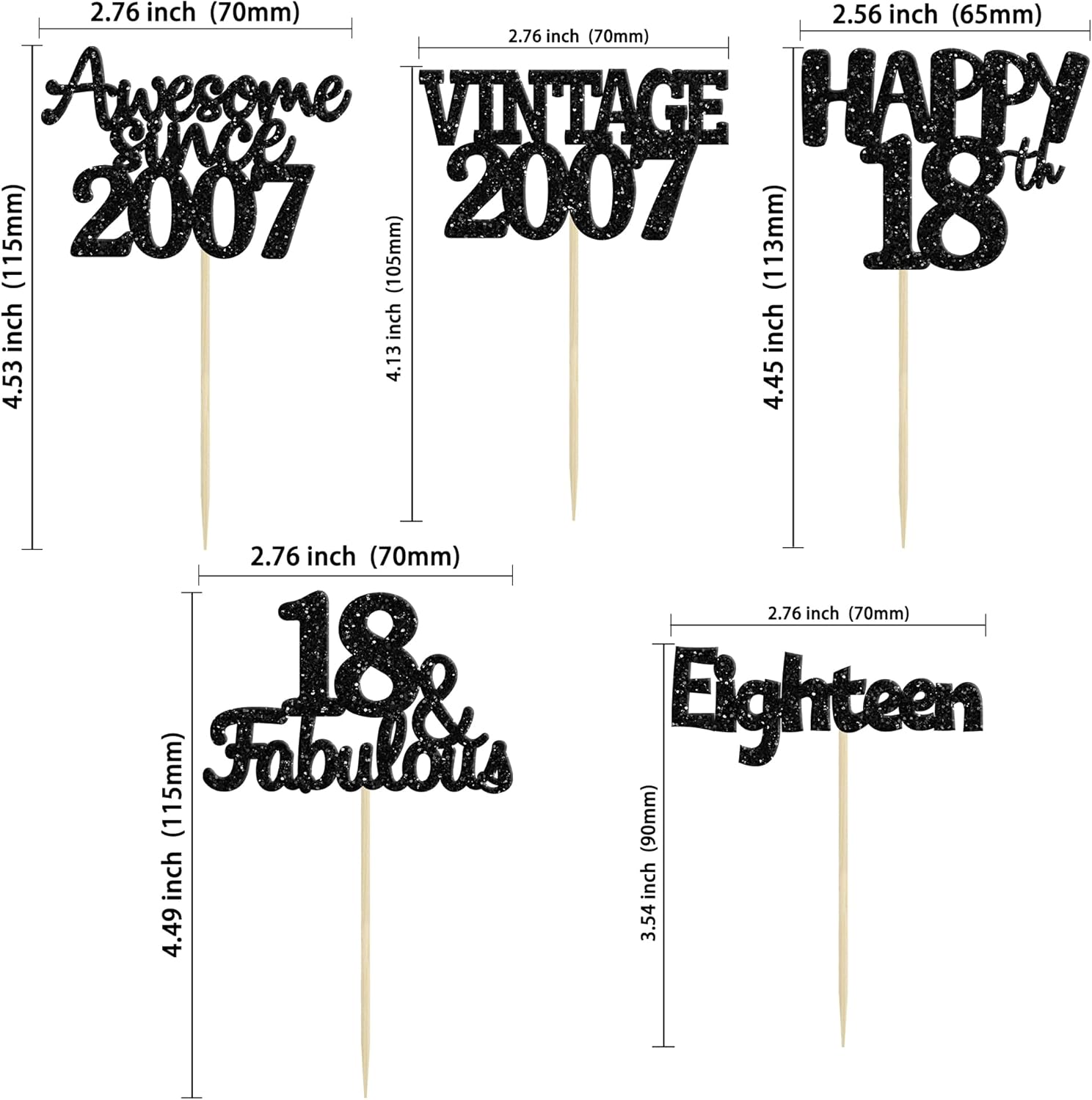 - ♡These glitter 18th birthday Cupcake Toppers are so cute and good for vintage 2007 theme party, 18th birthday party, 18th wedding anniversary birthday party cake decoration. They can make your cupcake more attractive and bring the fun to your party. You can also apply them for ice cream, fruits, cookies and other desserts.