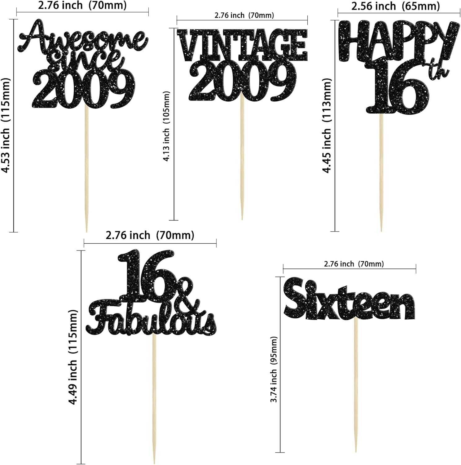 - ♡These glitter 16th birthday Cupcake Toppers are so cute and good for vintage 2009 theme party, 16th birthday party, 16th wedding anniversary birthday party cake decoration. They can make your cupcake more attractive and bring the fun to your party. You can also apply them for ice cream, fruits, cookies and other desserts.