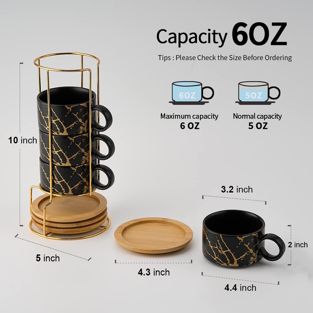 LUKA Porcelain Espresso Cup with Metal Stand, 6 Ounce Stackable Ceramic Demitasse Espresso Mugs Cappuccino Cups Set for Latte,Coffee,Cafe Mocha,Tea(Set of 4,Black)