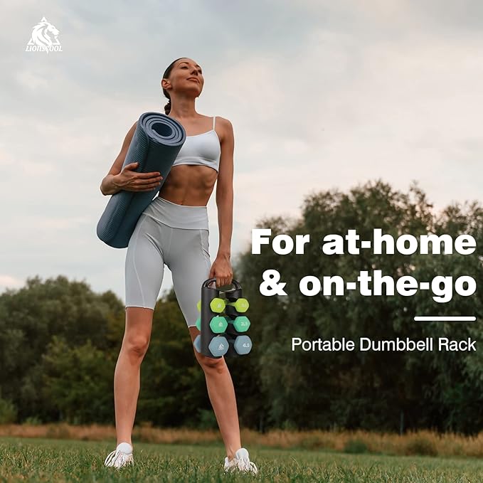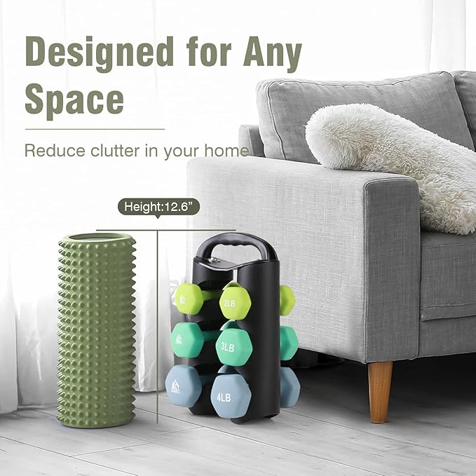 - Graceful Present for Your Friends / Family: Set includes pairs of 2lb, 3lb, 4lb neoprene coated hex dumbbells with a unique dumbbell rack for storage, which is perfect for daily workout targeting specific muscles. Light bright color and soft touching feel will please everyone. It also comes with a poster to help plan your workout.