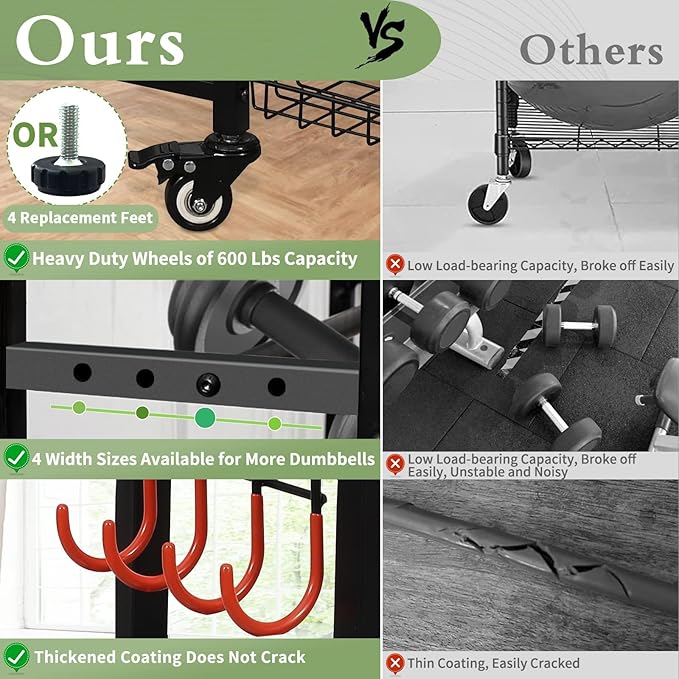 - 🤸♀️【Moveable Dumbbell Rack for Home Gym】 Four heavy duty stem casters (including 2 lockable) on the bottom provide a total of 600 lbs capacity to make the dumbbell stand move around from place to place. Smoother & Quieter & No noise. They can lock in place or can be replaced with attached 4 stationary feet.