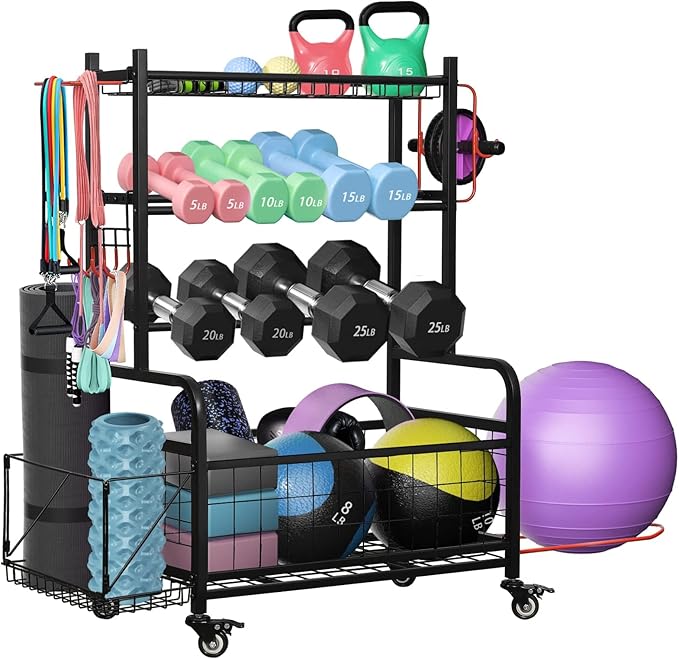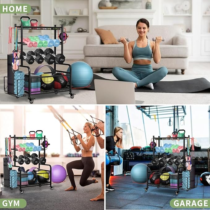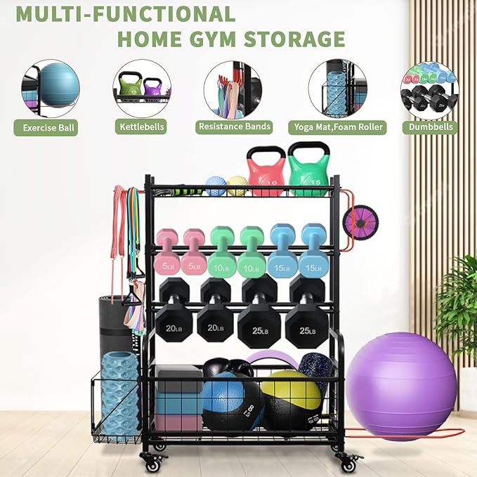 - 🏋️【All in One Large Home Gym Storage Rack】 Our weight rack have enough different storage space to fit fitness equipment. Top storage shelf for kettlebells, 2-layer weight rack for dumbbells, bottom storage basket for yoga wheel, yoga block or balls, side basket and hook (Removable and Reversible) for yoga mat, rollers, resistance bands. Side U-shaped holder for exercise ball. It holds everything in a neat and organized manner and keep space tidy.