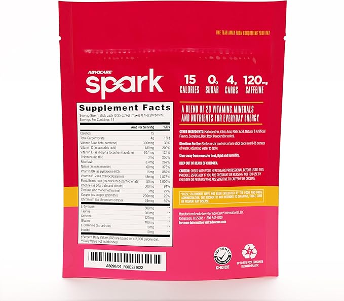 AdvoCare Spark Vitamin & Amino Acid Supplement - Focus & Energy Drink Powder Mix with Vitamin A, B-6, C & E - Also Includes L-Carnitine & L-Tyrosine - Cranberry Peach Orange, 14 Stick Packs