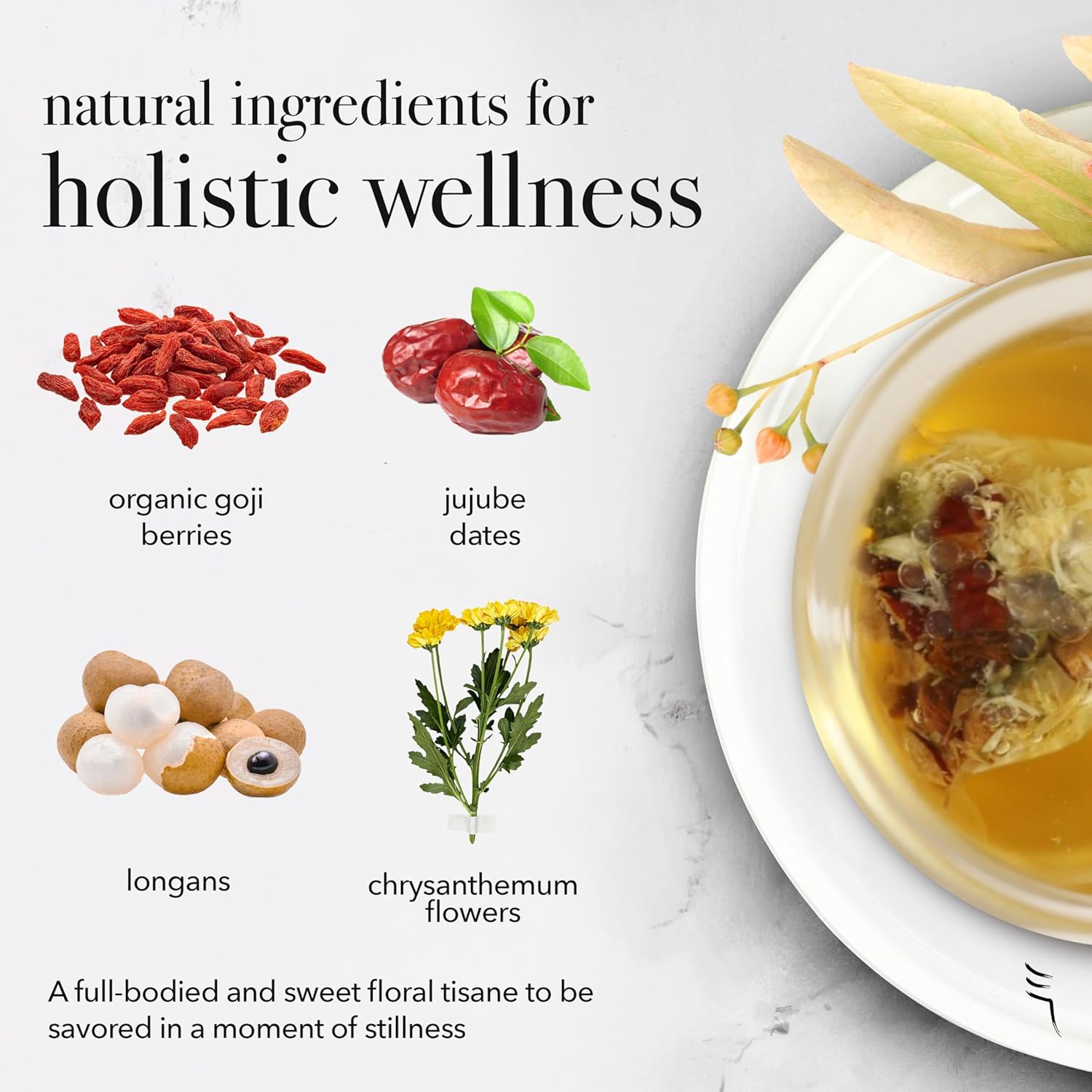 qìsane Chrysanthemum Tea Bags with Organic Dried Goji Berries - Dried Chrysanthemum Flowers, Dried Longan Fruit & Jujube Dates - Herbal Tea to Support Calmness & Well-Being - 10 sachets (~30 cups)