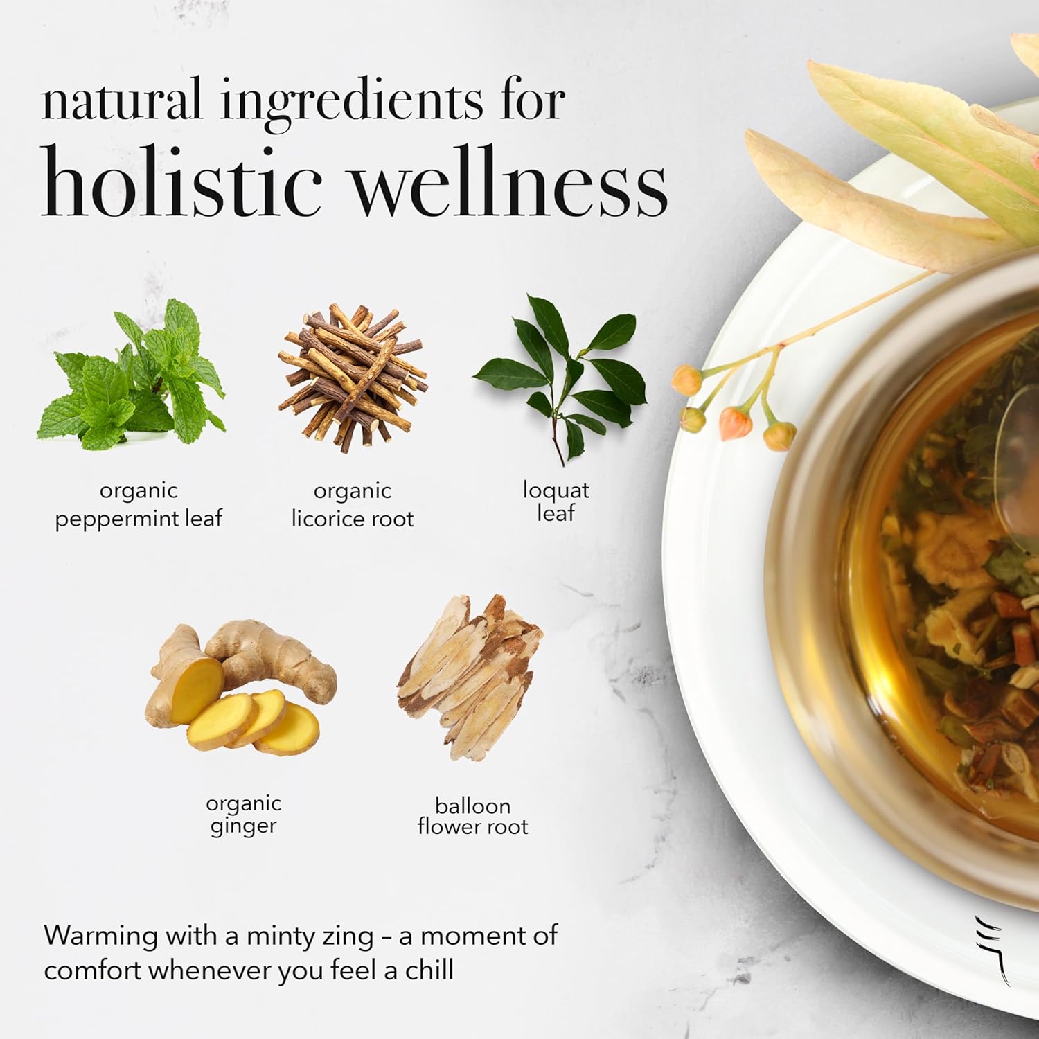 - COMFORTS & SOOTHES: A caffeine-free, warming infusion combining loquat leaves to ease throat irritation, whole dried peppermint leaves to promote respiratory ease, balloon flower plant to help support lung and kidney function, and ginger root to help stimulate digestion; each sip helps promote balance and calm