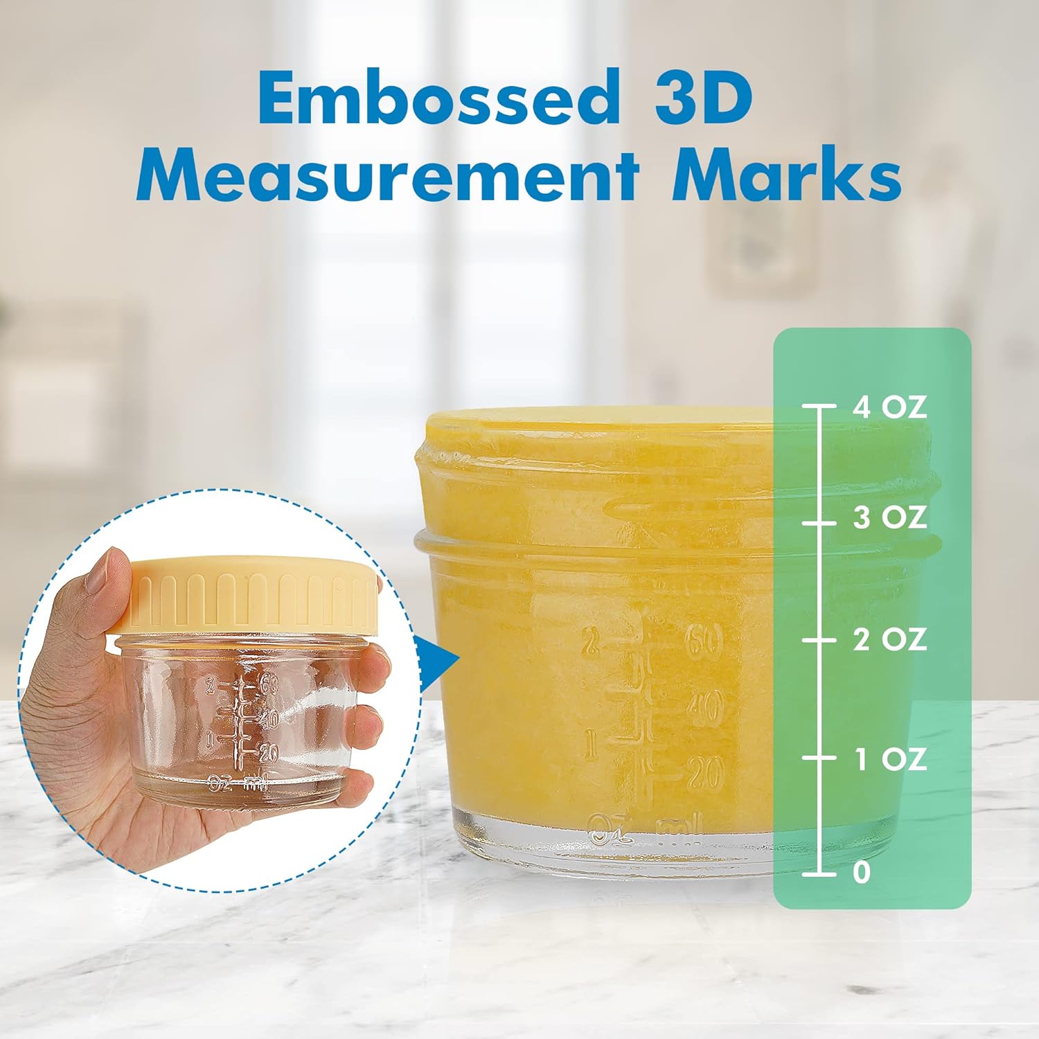 - GREAT VALUE 24-PACK 4OZ GLASS BABY FOOD JARS: The jars come with easy-to-see, non-fading embossed measurement marks showing up to 2oz, however, when filled to the rim, the jar’s capacity is 4oz. Perfect portion size for your baby or toddler and the 24-pack makes it easy for you to offer a variety of homemade foods for a healthy and balanced diet.