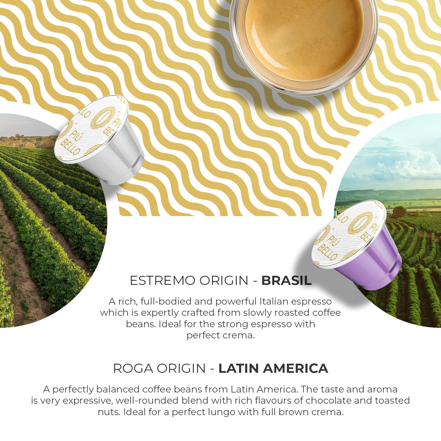 - 6 FLAVOR MULTIPACK COFFEE - Choose this 6 flavor multipack of Nespresso pods and enjoy every delicious variety from Piu Bello including Bogota flavor, Roga flavor, Lazio flavor, Piu Bello Blend, Espresso Bionda, and Espresso Estremo. Made from 100% Colombian Arabica beans
