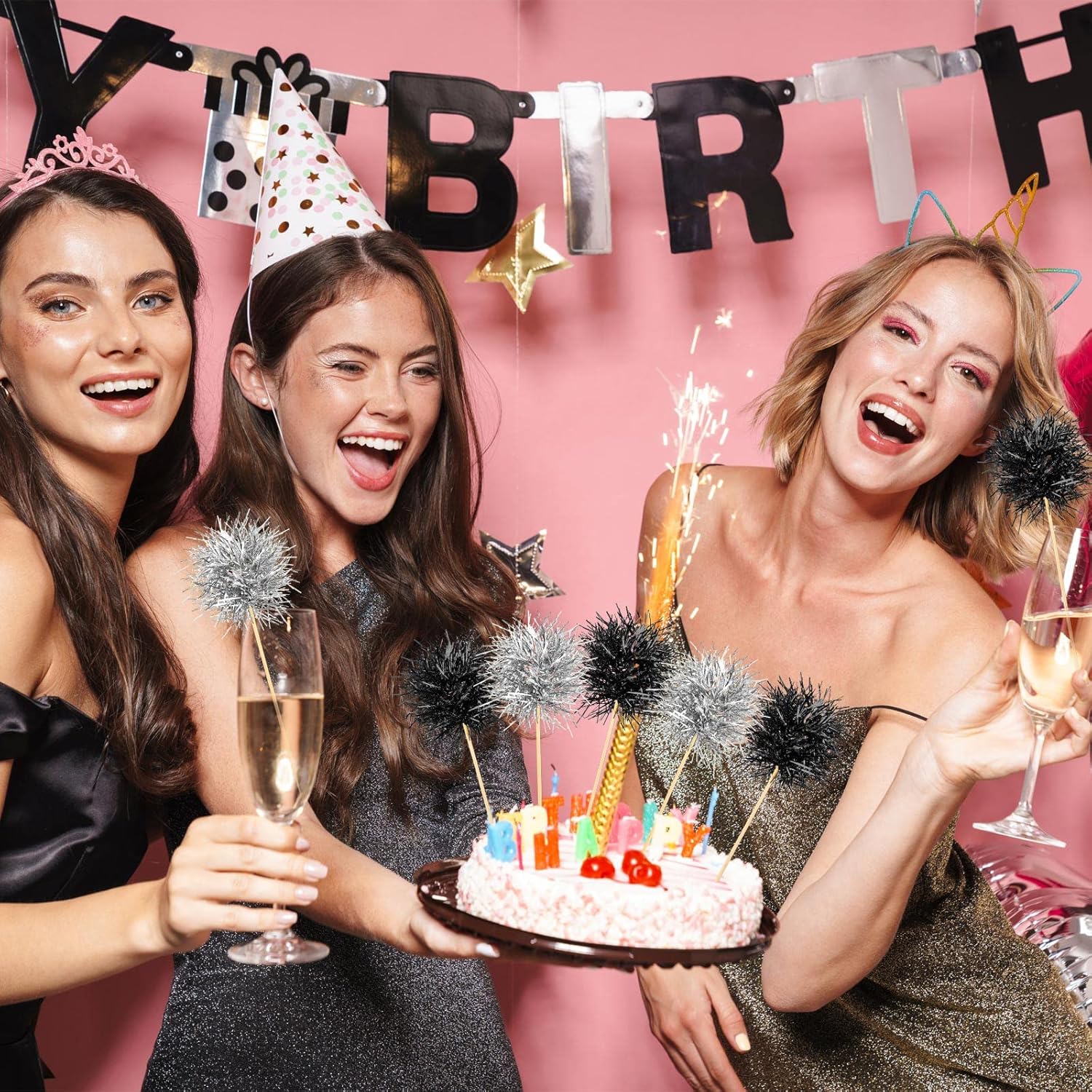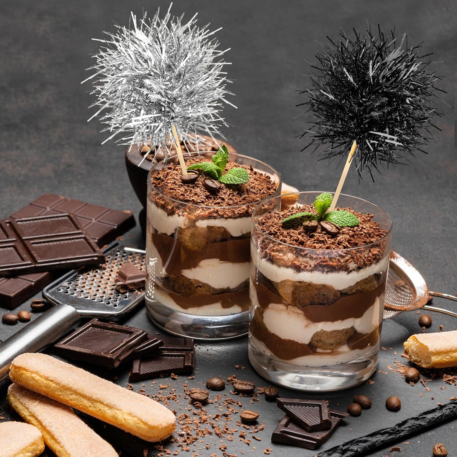 Chinco 100 Pcs Foil Firework Cupcake Toppers Sparkle Tinsel Cake Toppers Cake Decoration Cocktail Fruit Toothpick for Birthday Wedding Graduation Party(Silver, Black)