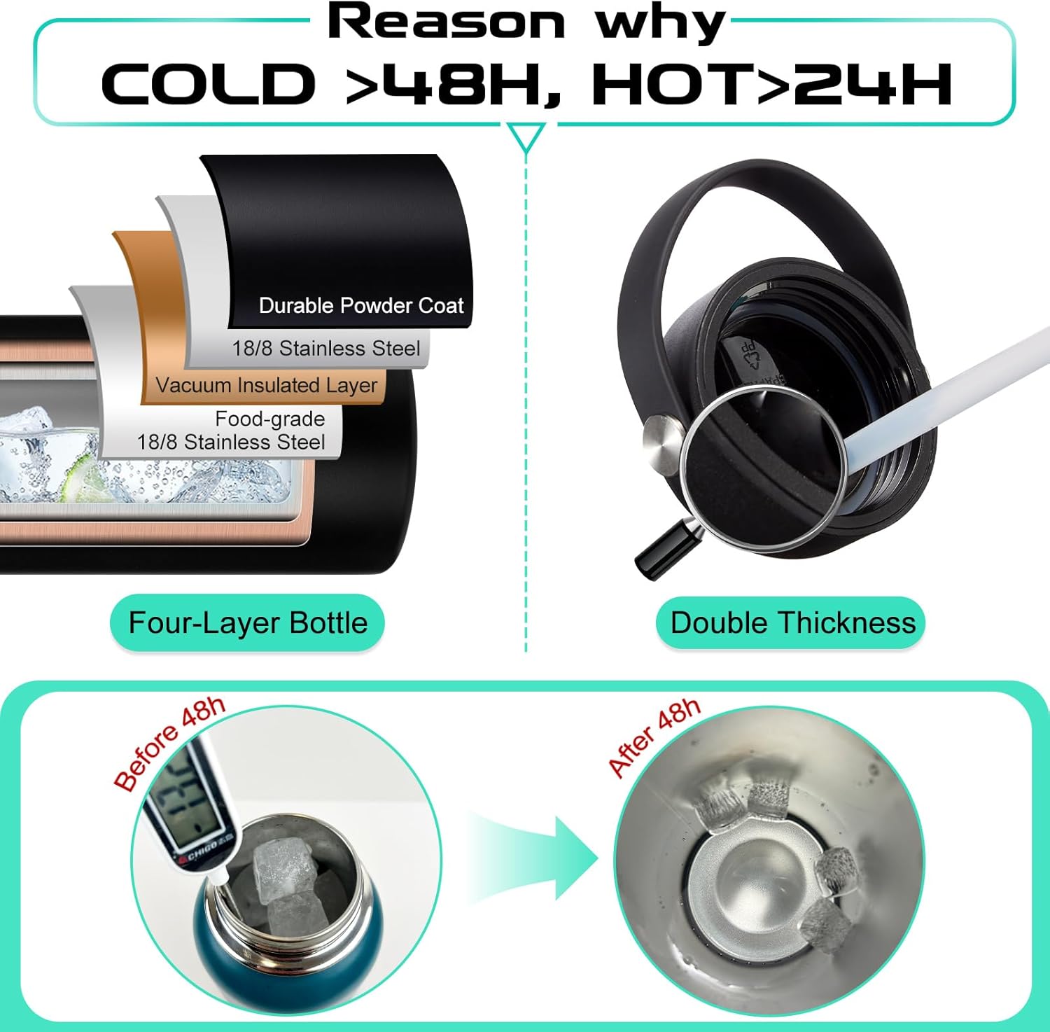 - TRIPLE-INSULATION & HIGH-PERFORMANCE: This wide mouth 1 gallon water bottle features triple-wall vacuum insulation and pro-grade stainless steel, it keep-cold for 48 hrs and keep-warm for 24 hrs without altering the taste and keeps your water tasting fresh. Using this metal water bottle on hot summer days or your next camping trip to stay hydrated all the day