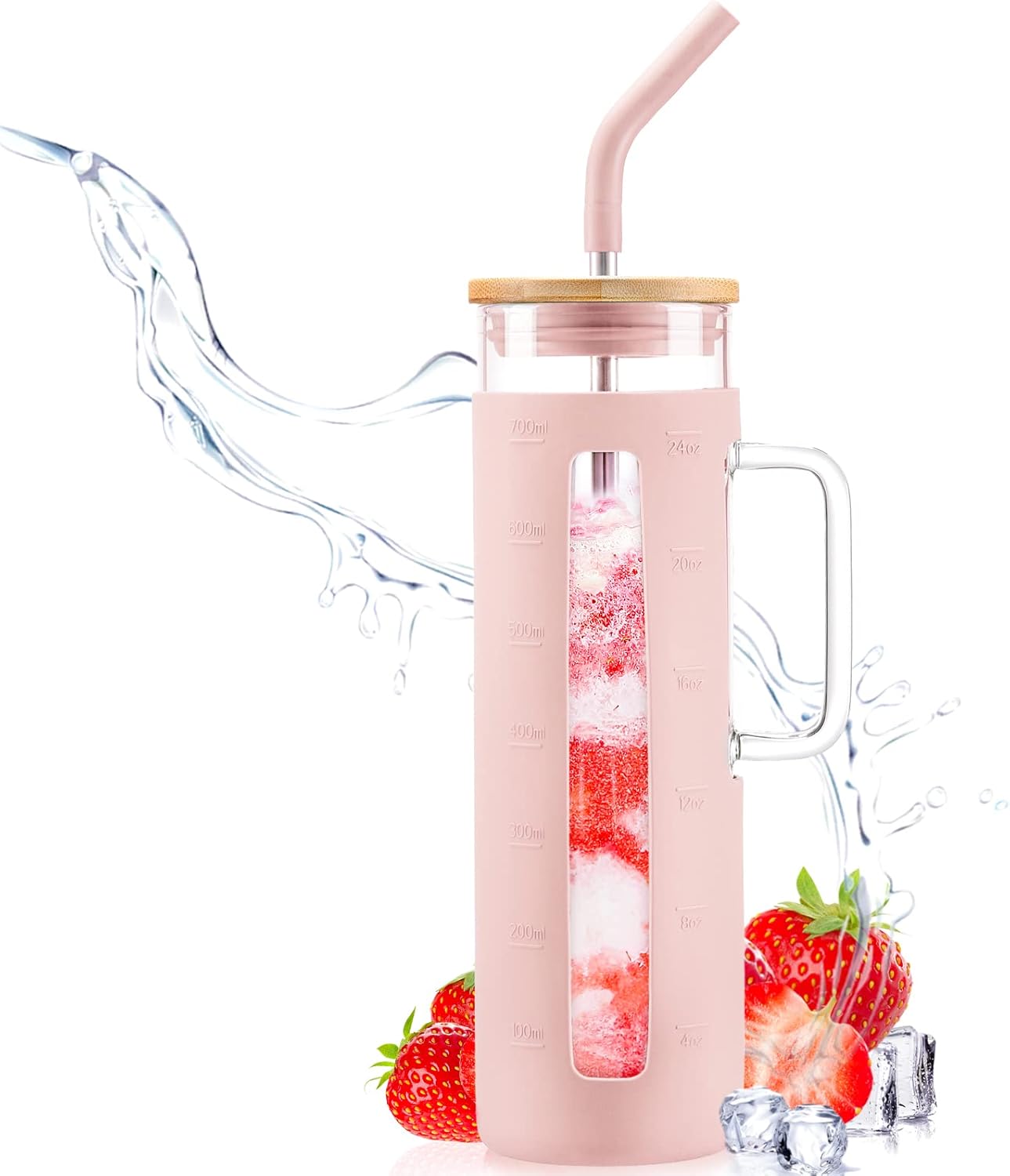 Kodrine Glass Tumbler with Lid and Straw, 24 oz, Iced Coffee Cup Boba Smoothie Cup, Home Office Tumblers, Pink