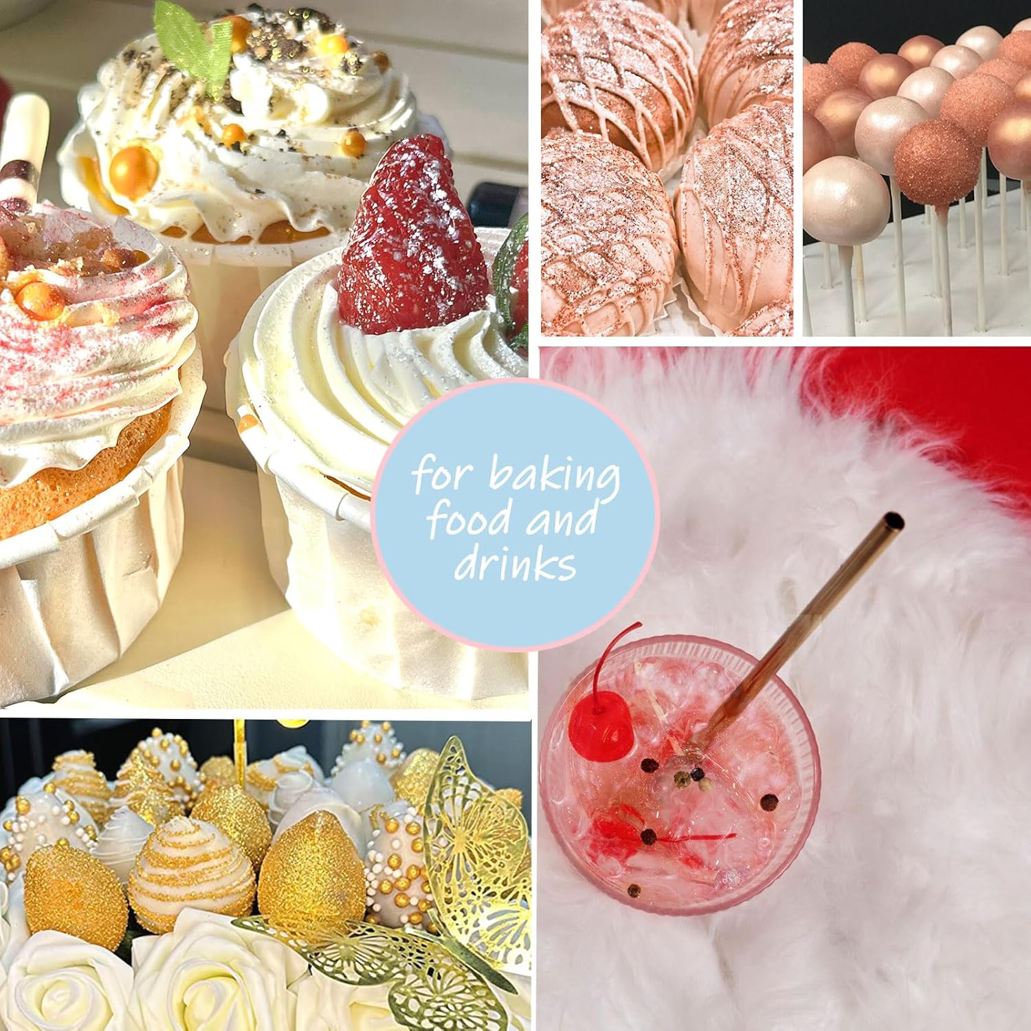- Widely Used Edible Glossy Glitter for Desserts - Shimmer disco edible glitter dust is great to use for strawberries, chocolates decoration, cookies, fondant, elevates cakes, cupcakes, cake topper, and other gourmet baked goods, metal finish, fudge/chewing gum, pull candy/isomaltose, etc., It is also suitable for parties drinks decorating, like champagne, beverages, cocktails, and more