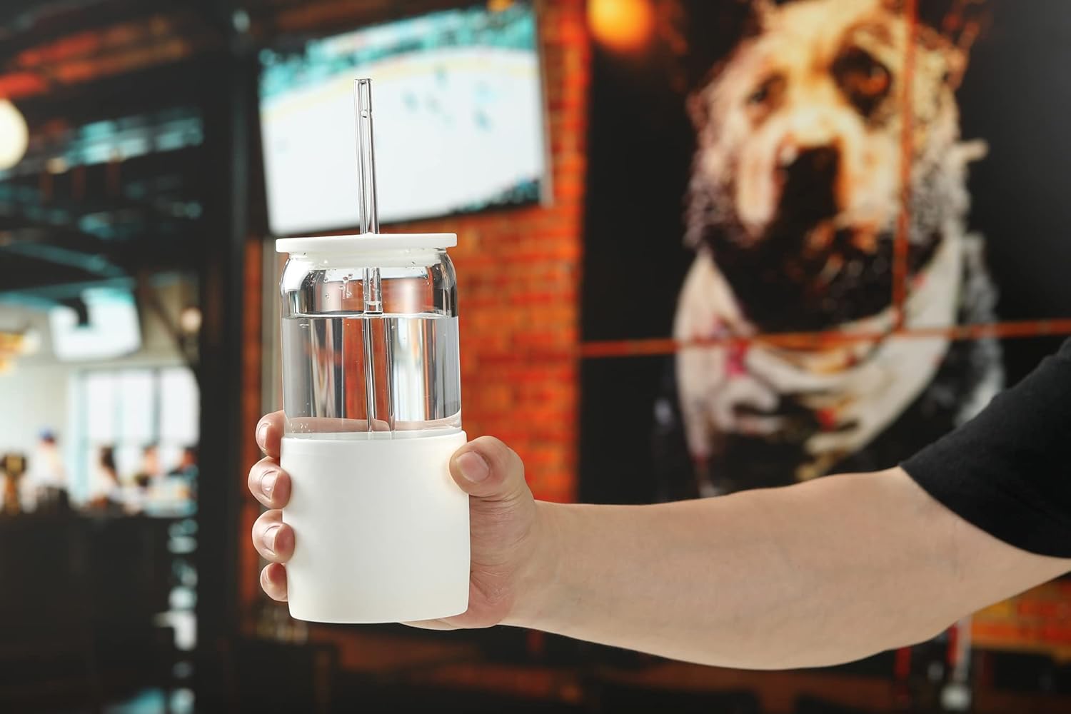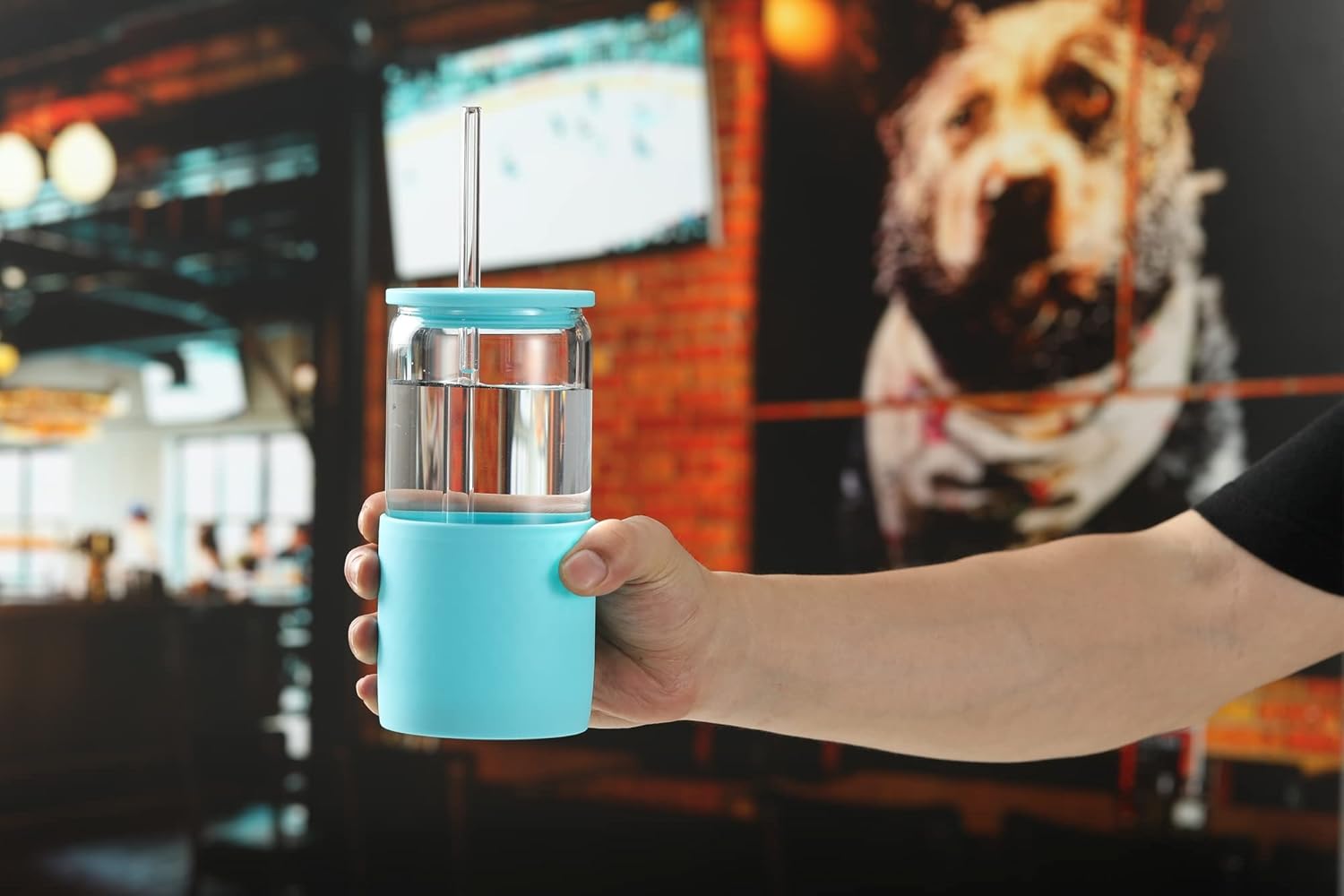 - The unique silicone sleeve and lid design provides a strong protection for the glass cup. if the glass cup is accidentally turned over on the desktop, the chance of breaking is very small, and the sealed lid ensures that the liquid will not overflow.