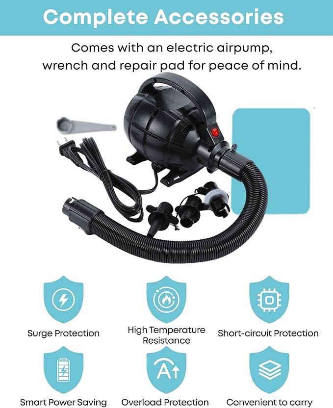 - ⭐【COMPLETE KIT, LIFETIME SUPPORT】Includes electric pump + repair patches. Fix punctures in minutes and enjoy lifelong durability. (Backed by a 1-year warranty!)