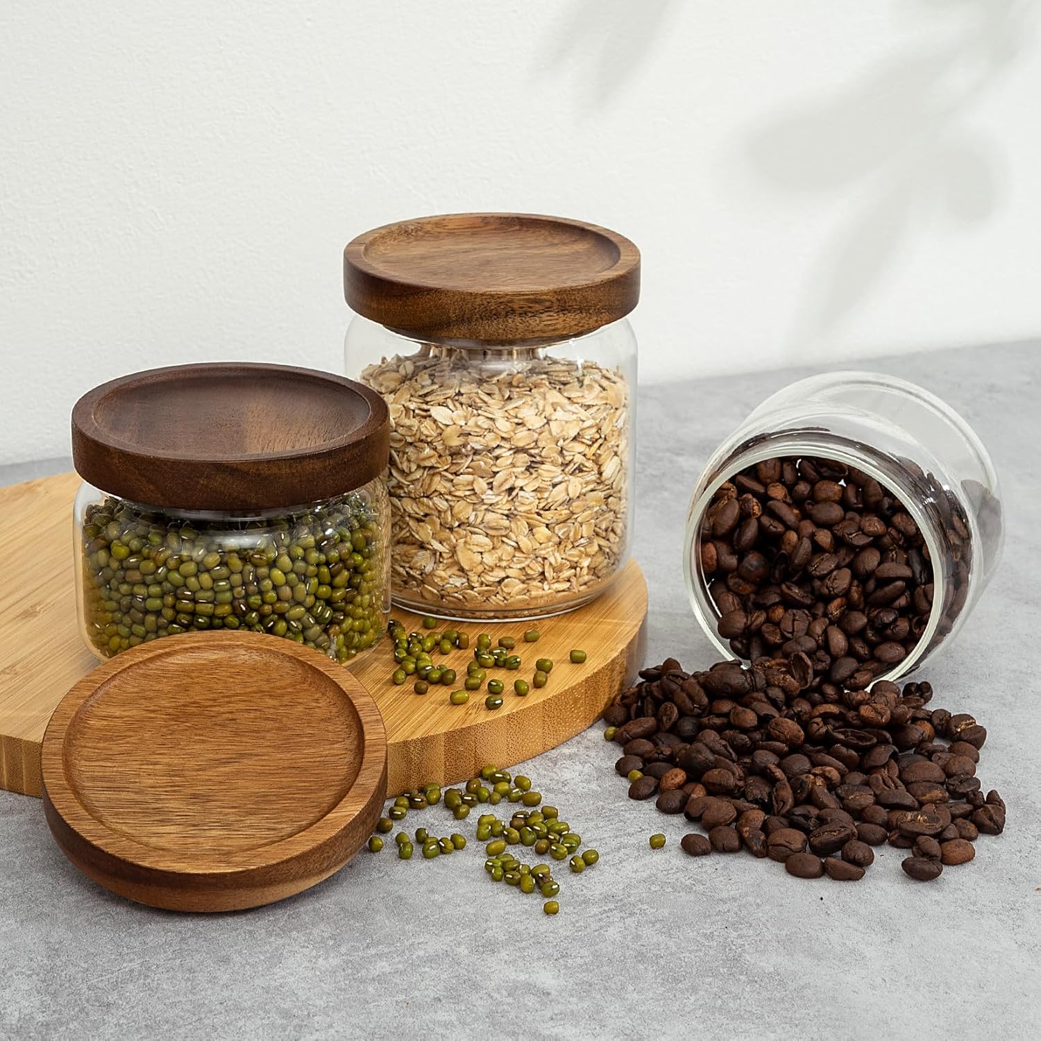 1 PC Small Glass Storage Jars with Airtight Lids, 17 fl oz (500ml) coffee container with Wooden Lid, Glass Pantry Canister for Beans, Rice, Sugar and etc