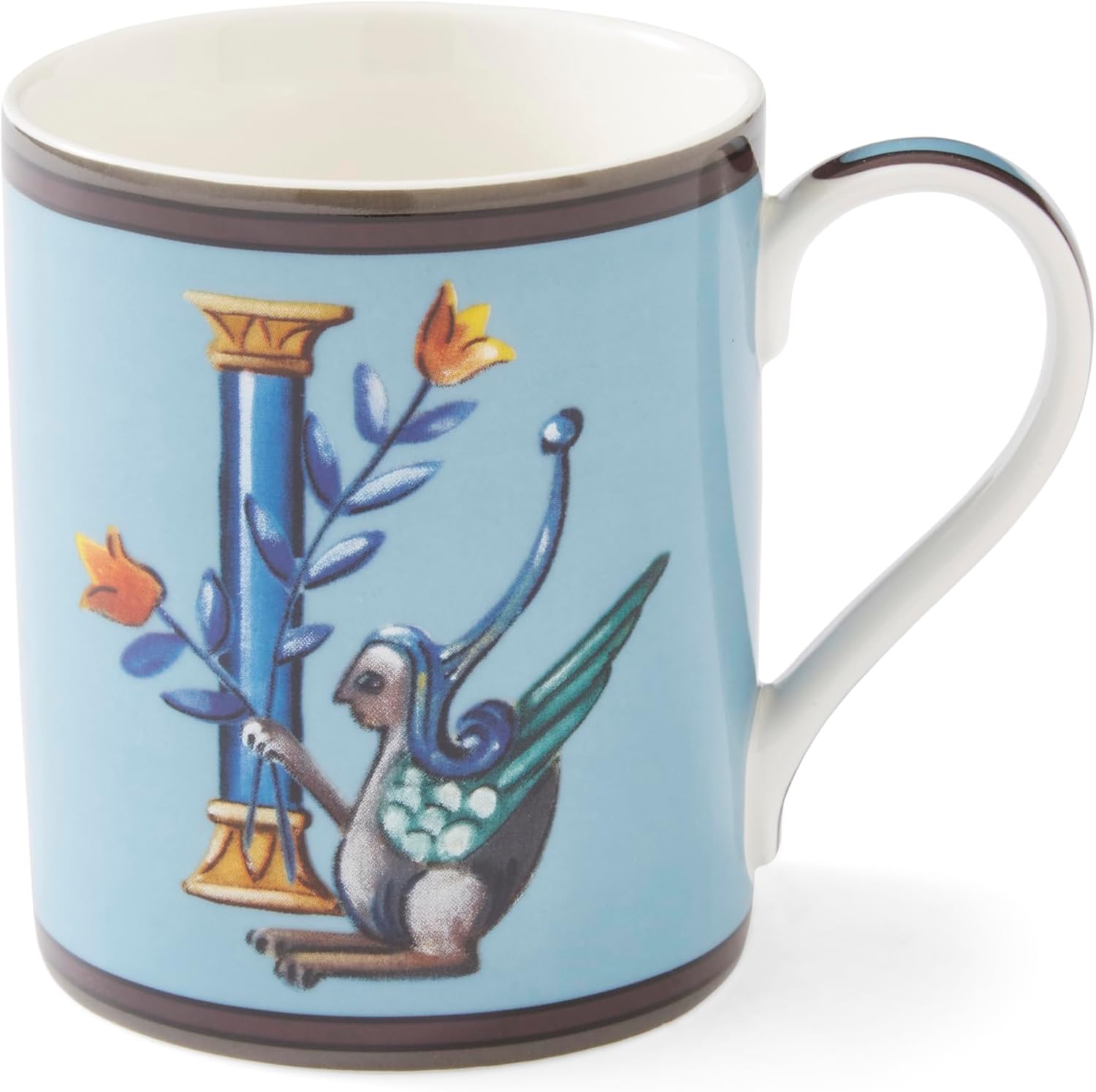 - Add Personality to Sips: This custom 12 oz letter cup is painted sky blue and features the letter 'I' column and a curious mythical creature in elegant blue tones.
