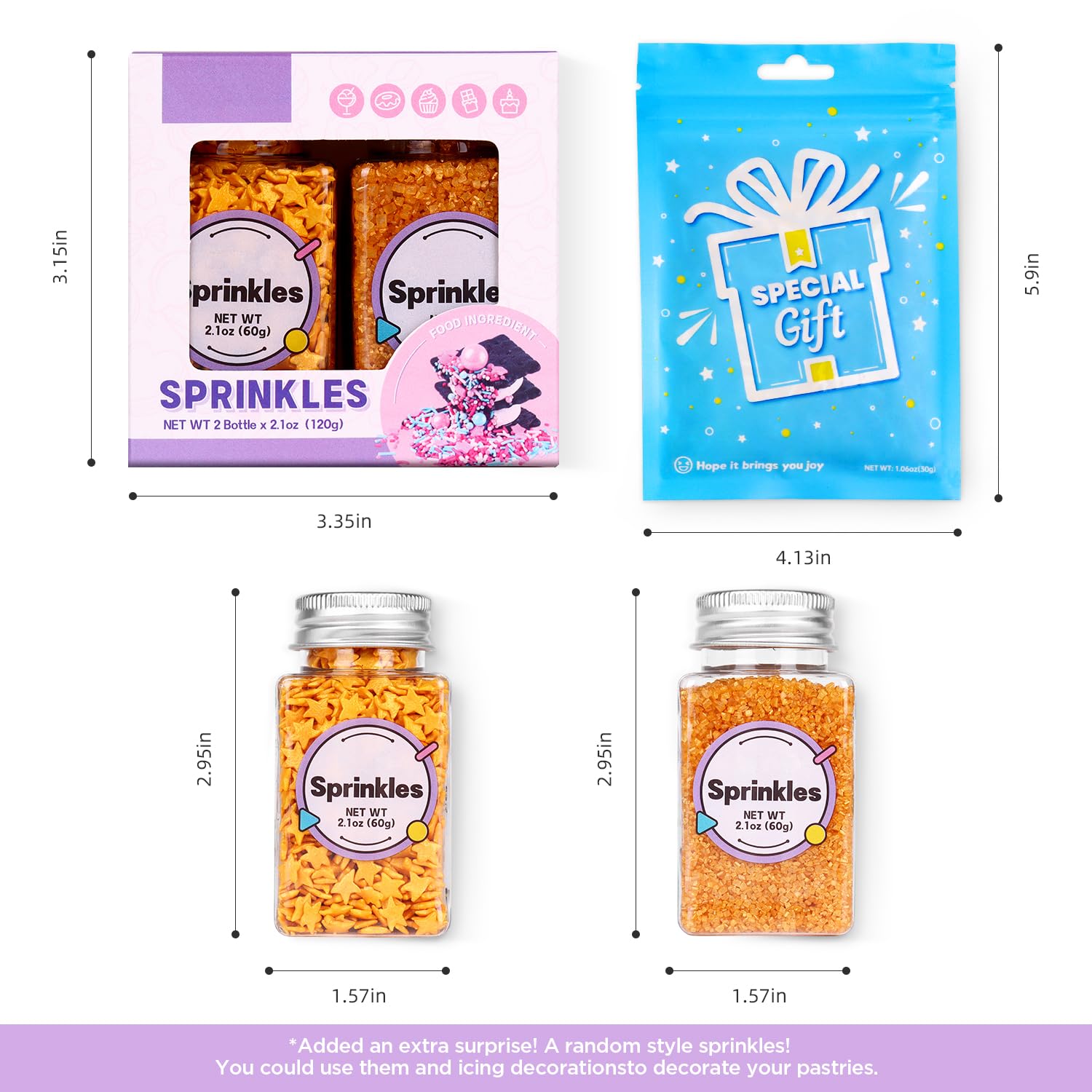 - Sugar Crystals: Gold sanding sugar crystals and gold star sprinkles top off your cakes, cupcakes, chocolates, cookies, donuts, marshmallows, macaron, and ice cream with a shimmering sugary sparkle. It's best for decorating after your items have already been baked, avoid melting during baking.