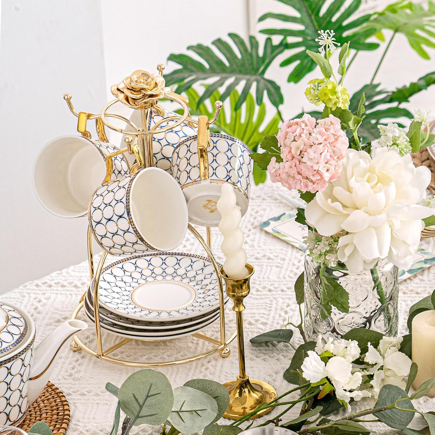 CwlwGO- Bone China Tea Cup Sets,15-Pieces Tea Cup and Saucer Set Service For 4 Whit 28 Ounces Teapot,Sugar Bowl,Creamer Pitcher and Spoons, Tea Gifts Sets For Women Patry.