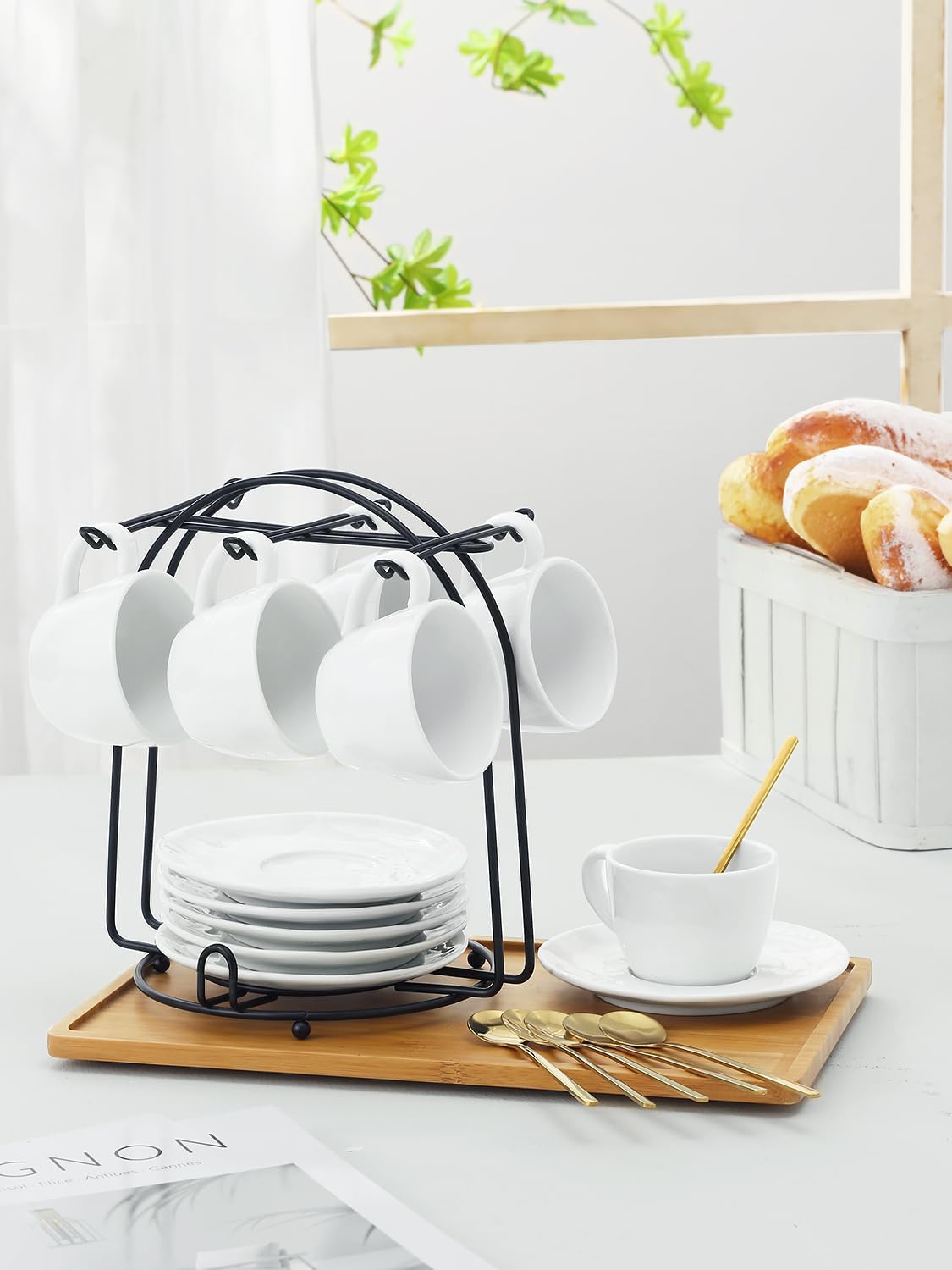 - Complete Coffee Set for Convenience: Includes six ceramic cups, matching saucers, and a sleek metal stand; comes with six spoons; keeps your coffee station organized and adds a sophisticated touch