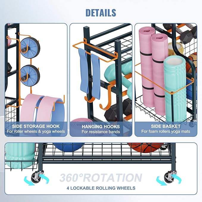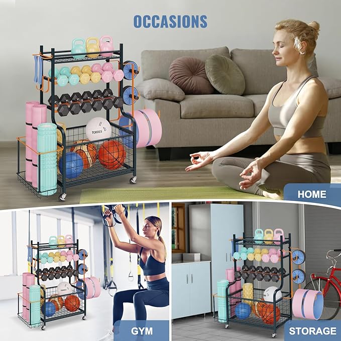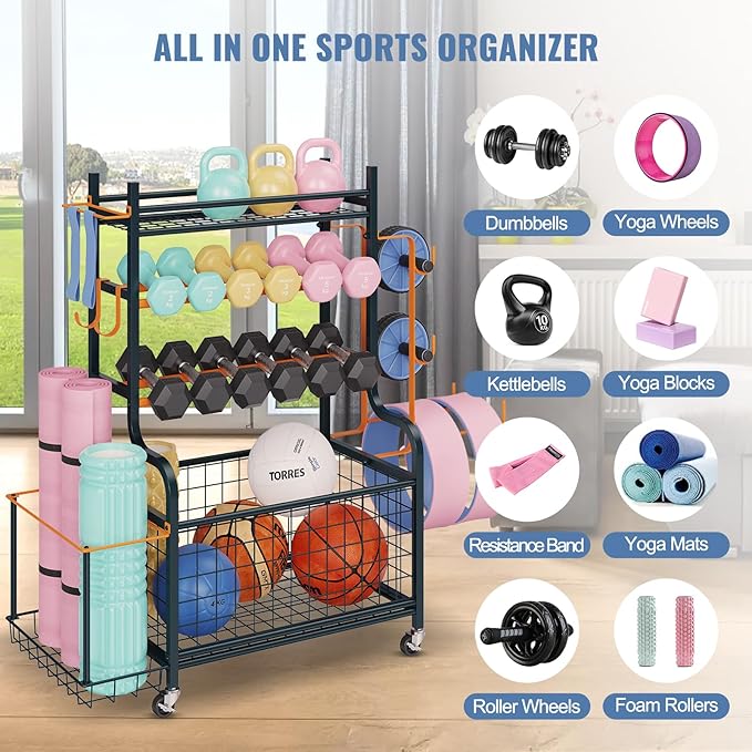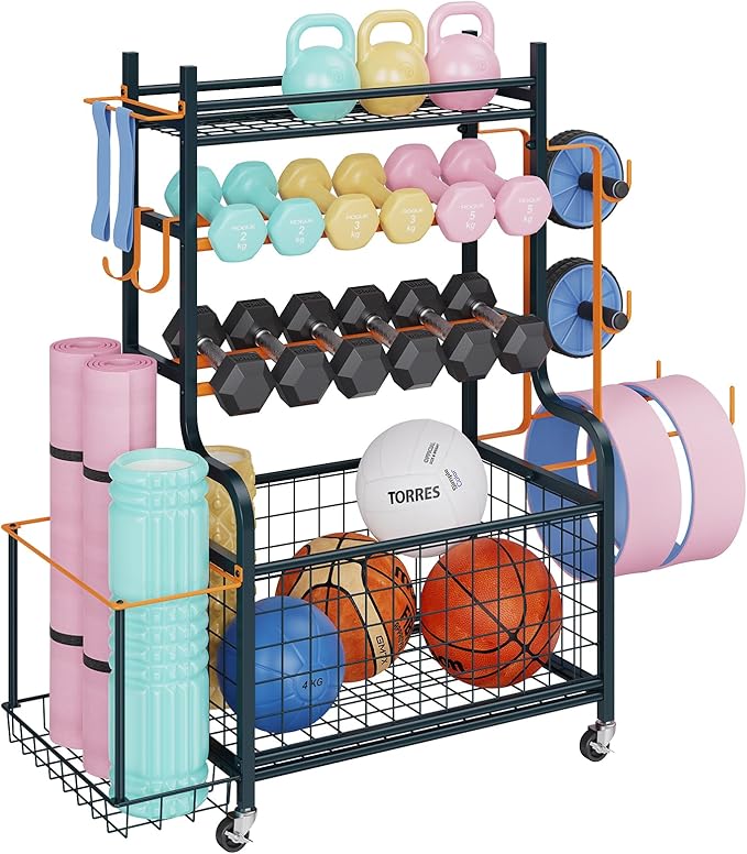 Weight Rack for Dumbbells, Yoga Mat Storage Rack Home Gym Equipment Storage Rack Cart for Dumbbells Kettlebells Yoga Mat, All in One Workout Equipment Storage Organizer Cart with Wheels and Hooks