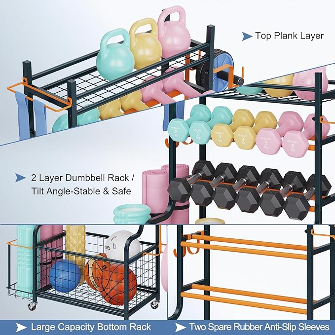 - 【Easy Accessibility】Searching for the right dumbbell mid-workout is not only time-consuming but also disrupts your flow;The open design and well-spaced shelves allow you to quickly identify and grab the dumbbells you need, saving you valuable time and maintaining your workout momentum and 360° rolling capabilities; Embrace the quality and functionality of our USA-designed dumbbells to take your fitness journey to new heights