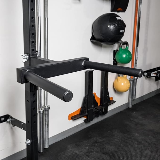 - DIP BAR ATTACHMENT: The dip bar and pin allow you to attach it to the squat rack uprights at differnt heights allowing you the ability for multiple exercises. You can do tricep dips, neutral grip pull ups, reverse rows, pushups and more!