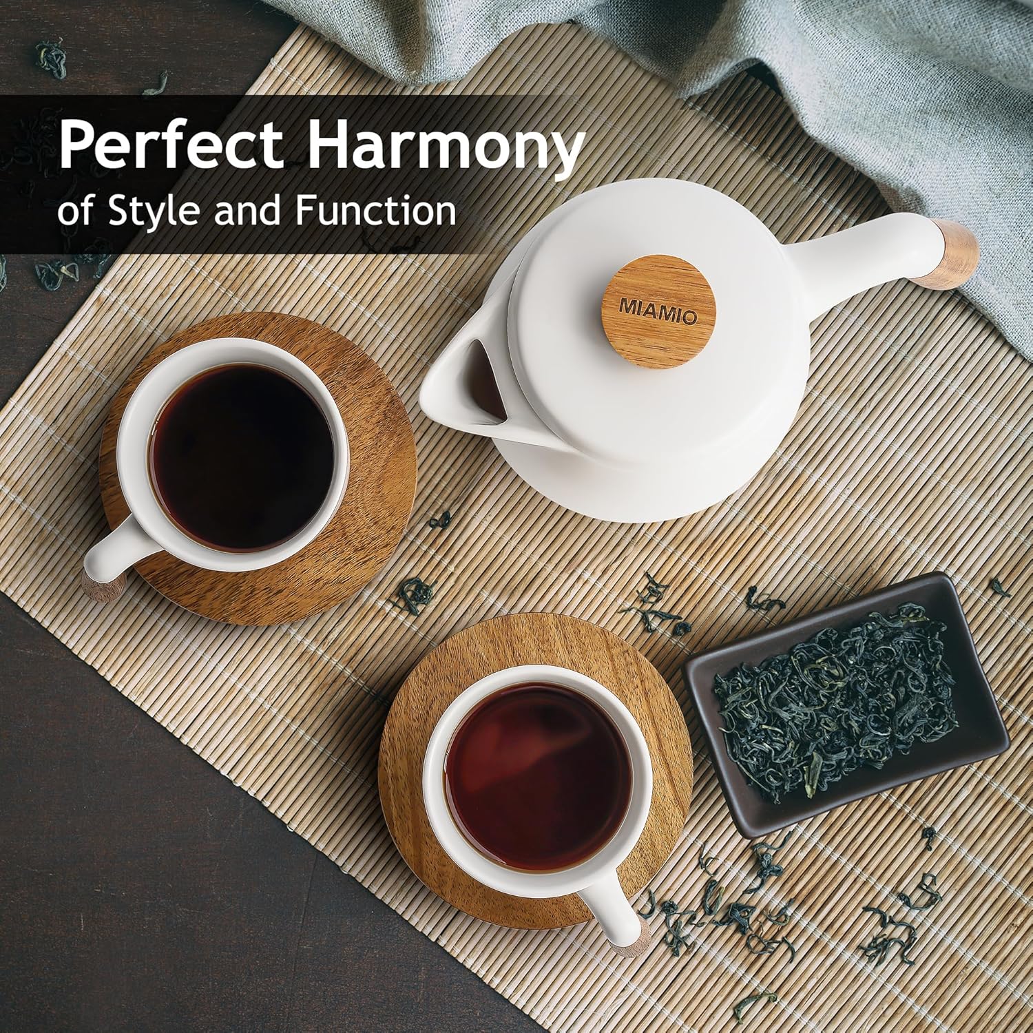 MIAMIO β 34 Oz Ceramic Tea Pot Set with Infuser and Cups/Tea Strainer, 4 Ceramic Tea Mugs (10 Oz), Bamboo Saucers/Handle for Home and Office (White)