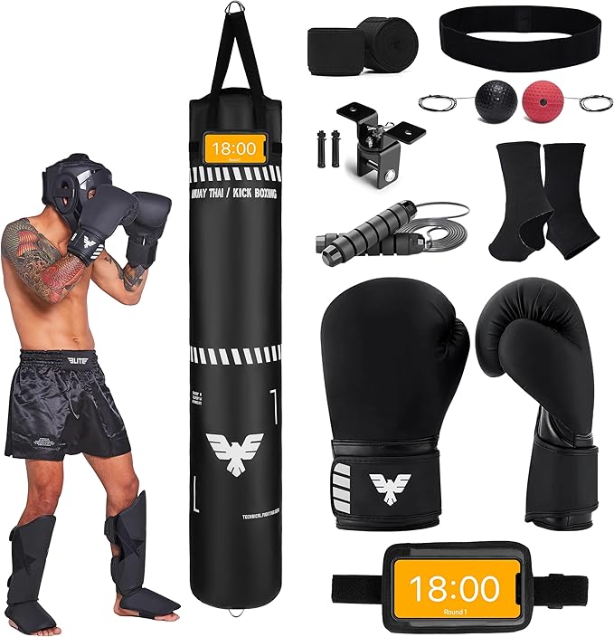 - MUAY THAI TRAINING KIT REFLEX BALL SET, SPEED JMUP ROPE: Muay Thai heavy bag for men comes with a muay thai training kit containing muay thai reflex ball, muay thai gloves, & mauy thai socks; muay thai equipment helps train taekwondo kicking bag, karate punching bag, jeet kune do punching bag & stabilize kickboxing heavy bag & provides a cushion when practicing leg strikes heavy kick bag; the PU boxing speed reflex ball set helps with speed & accuracy of punches with muay thai kick boxing bags.