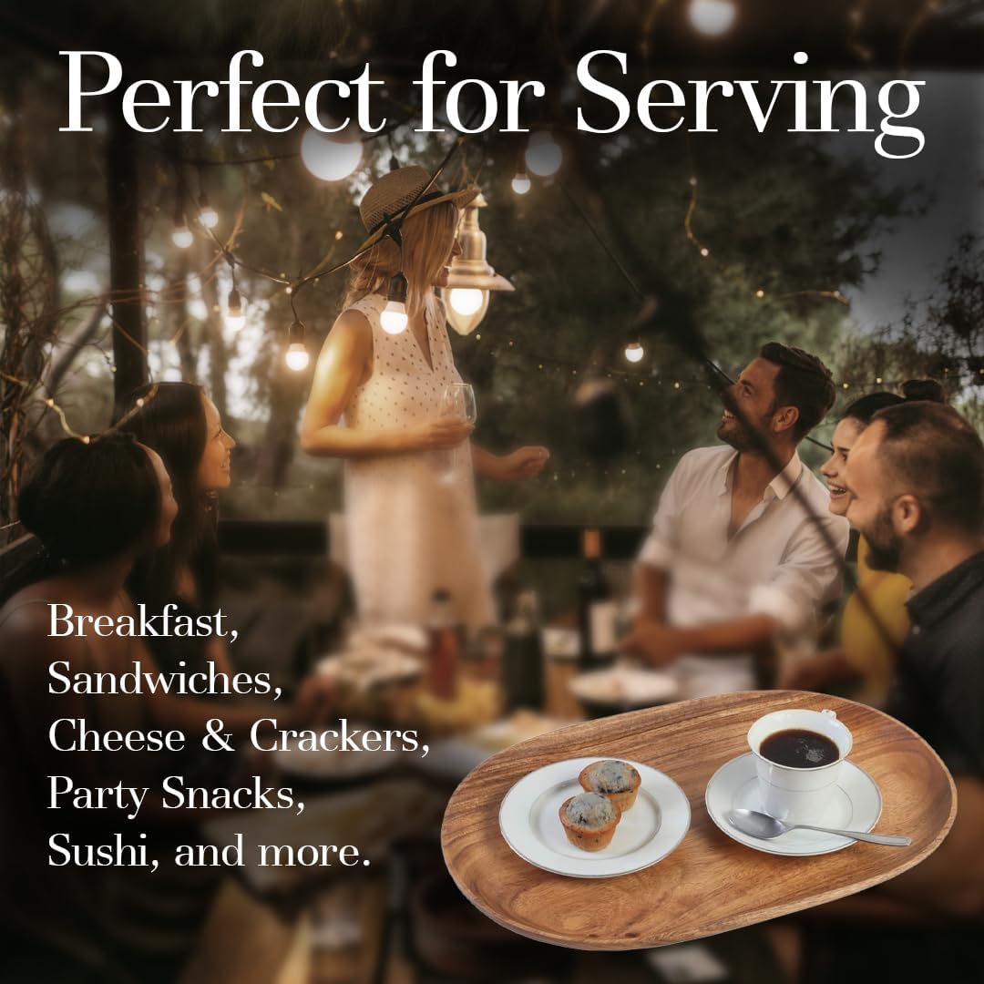 - SIZE: Our 10"W x 15"L, natural acacia wood, large oval tray is perfect for all of your entertaining and serving needs. Whether you are having a party at home of if you are a restaurant. Smaller, larger sizes and different finishes are available.