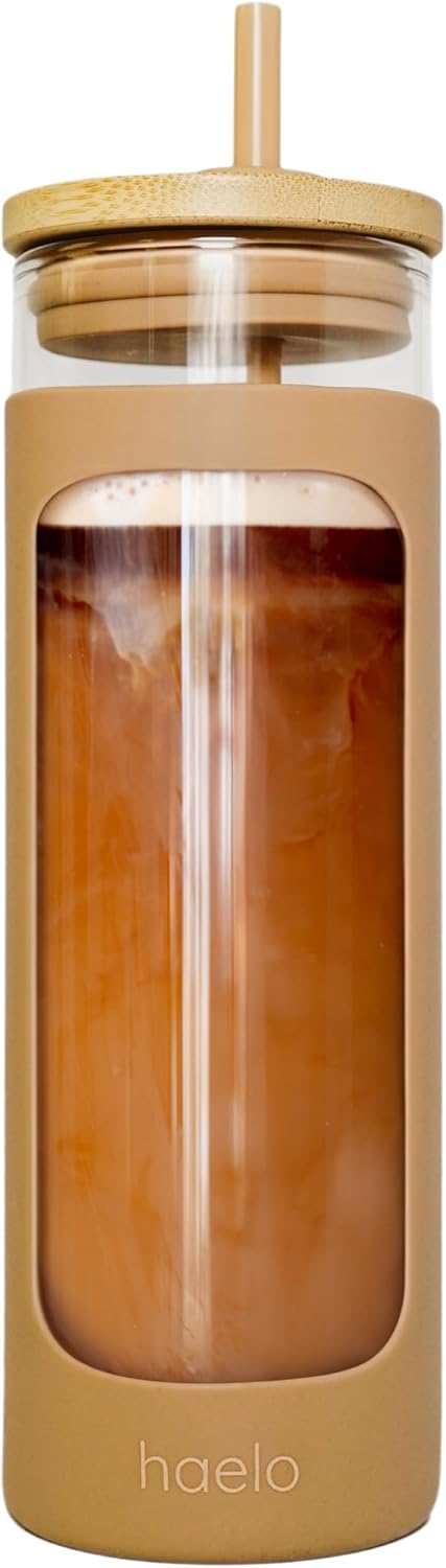 haelo 20oz Glass Tumbler Water Bottle, Iced Coffee Cup with Straw, Silicone Protective Sleeve, Bamboo Lid Reusable BPA Free (Amber)