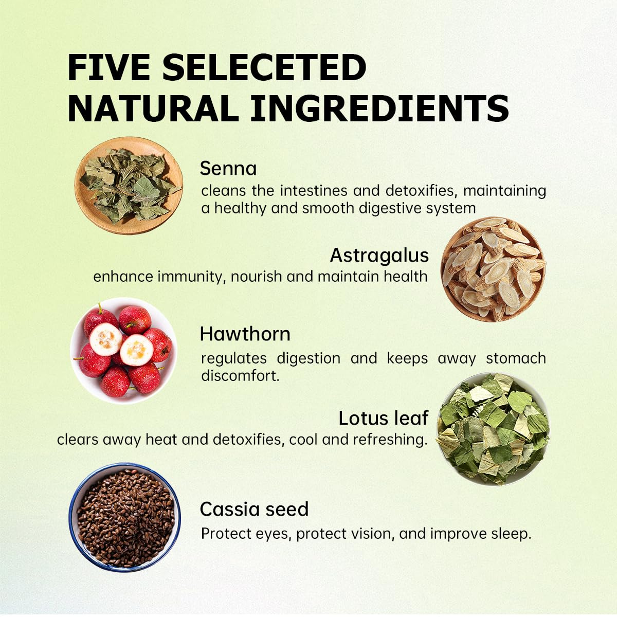 - Natural health : using high-quality natural ingredients such as senna leaves, astragalus, hawthorn, lotus leaves and cassia seeds, without additives, safe and health, to provide you with natural detoxification and beauty tea.