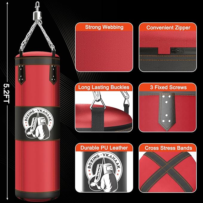 - 【Package Including】A complete set of boxing accessories brings the ultimate experience. they contain 1 x 4ft unfilled punching bag, 1 x 12oz boxing gloves, 1 x steel chain, 1 x connecting carabiner, 1 x boxing bag hanger, 1 x jumping rope, 1 pair Wrist band, 1 x counting grip.