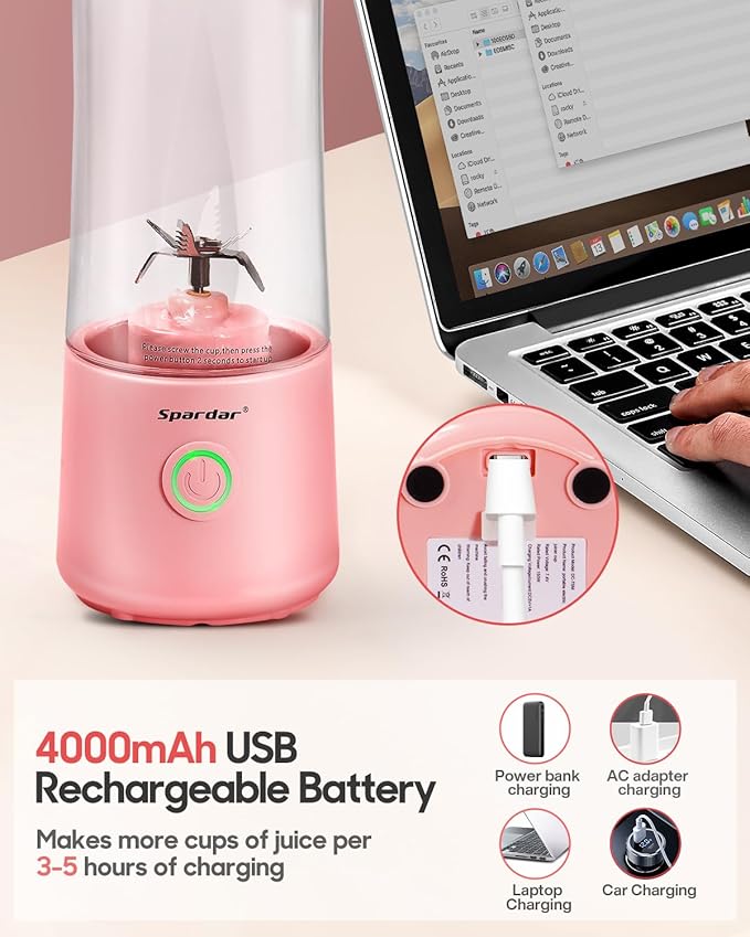 Spardar Portable Blender for Shakes and Smoothies, 4000mAh Personal Blender with 6 Blades, USB Rechargeable Blender Bottles Electric, Mini Blender Cup Portable Juicer for Home Sports Outdoors