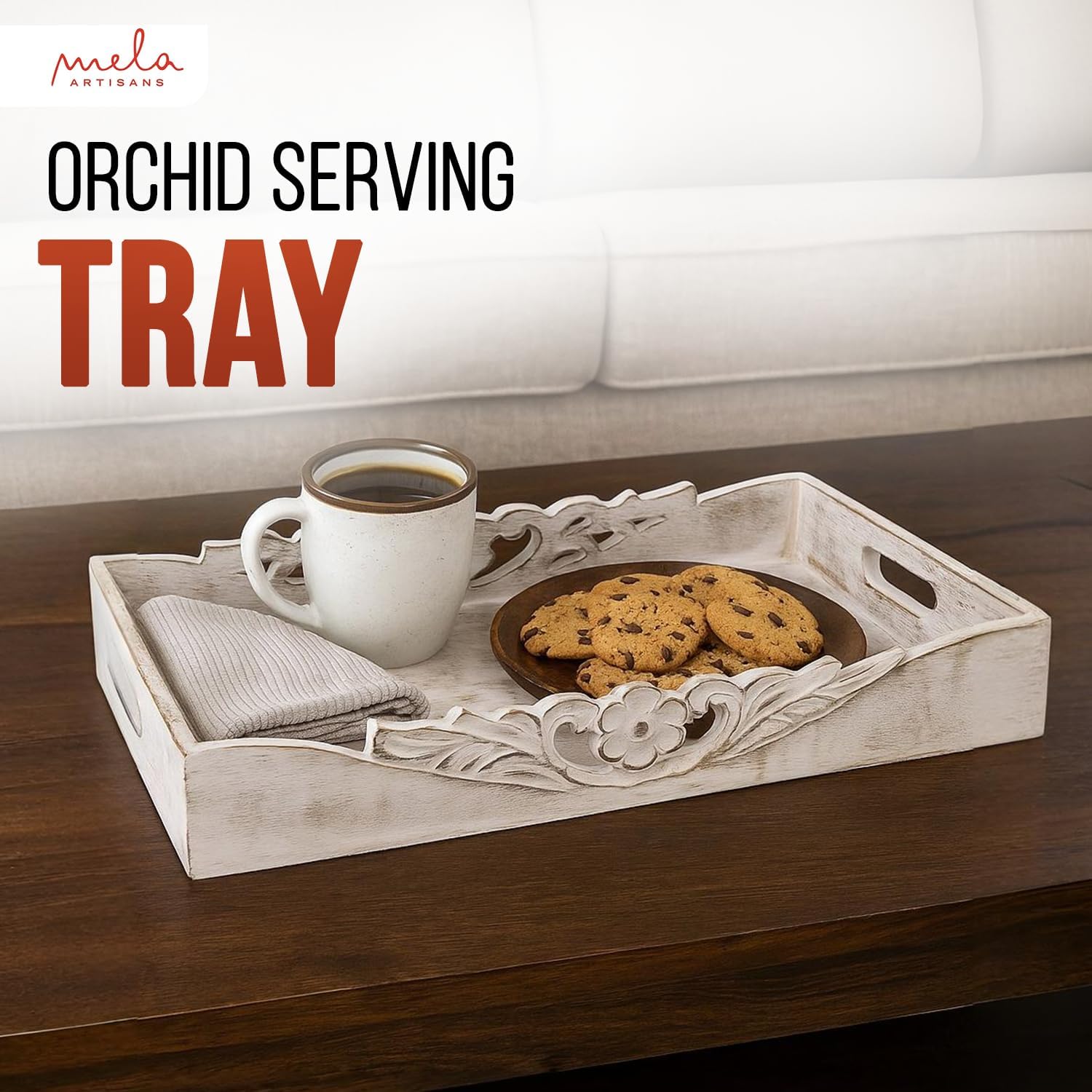 Mela Artisans Distressed White Wooden Decorative Tray with Handles | 16x12x2.5 Mango Wood Ottoman Tray | for Kitchen Countertop | Coffee Table | Snacks | Desserts | Breads | Bedroom Decor